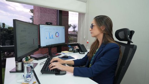 Rondinelli Ribeiro A imagem mostra uma mulher em escritório moderno, sentada diante de dois monitores com gráficos. Ela sorri enquanto digita, usando óculos e blazer. A mesa está organizada, e há uma janela ao fundo com vista externa.