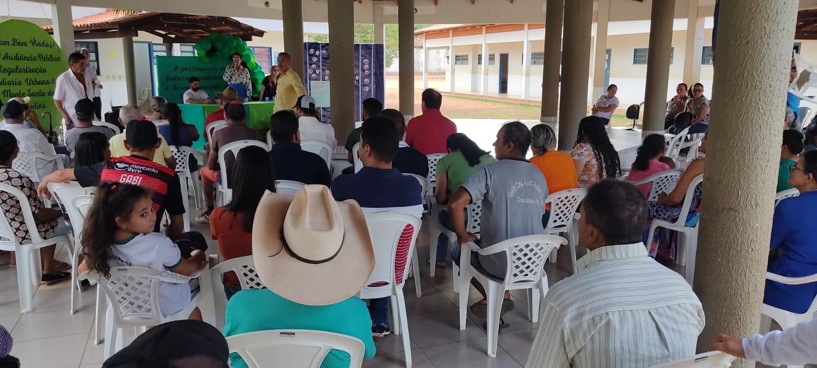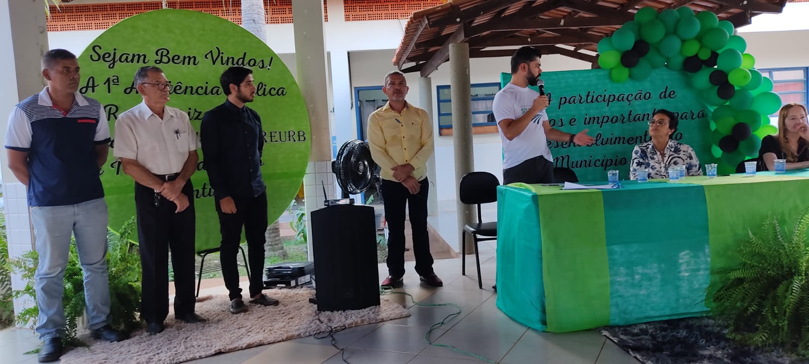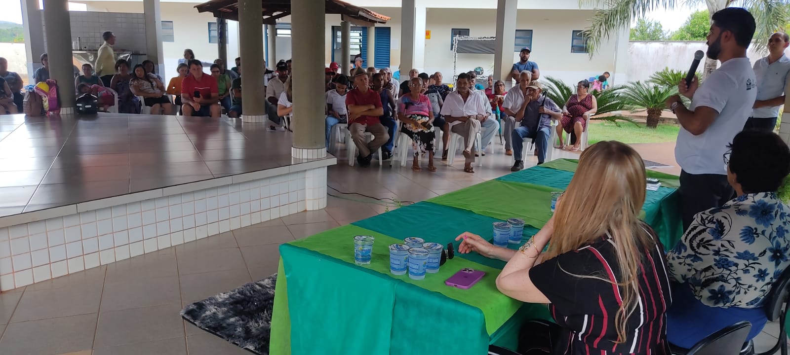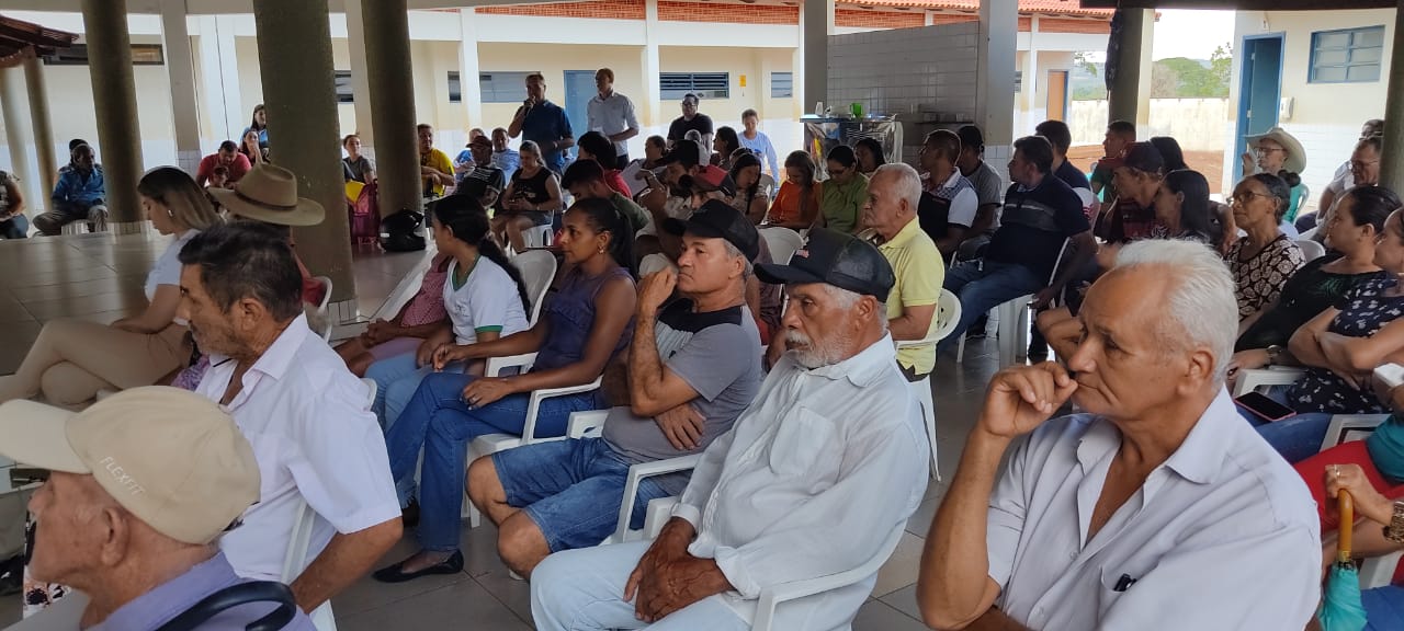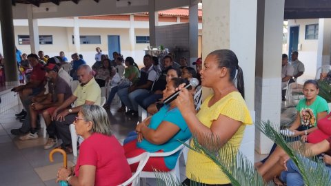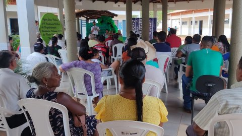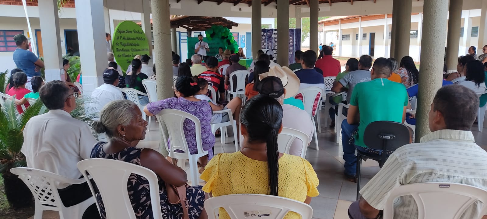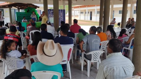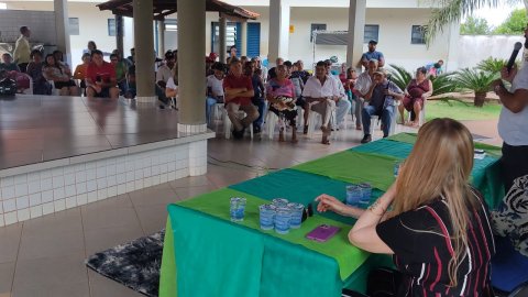 Divulgação Imagem mostra várias pessoas sentadas em cadeiras de plástico branca e ao fundo uma pessoa fala no microfone
