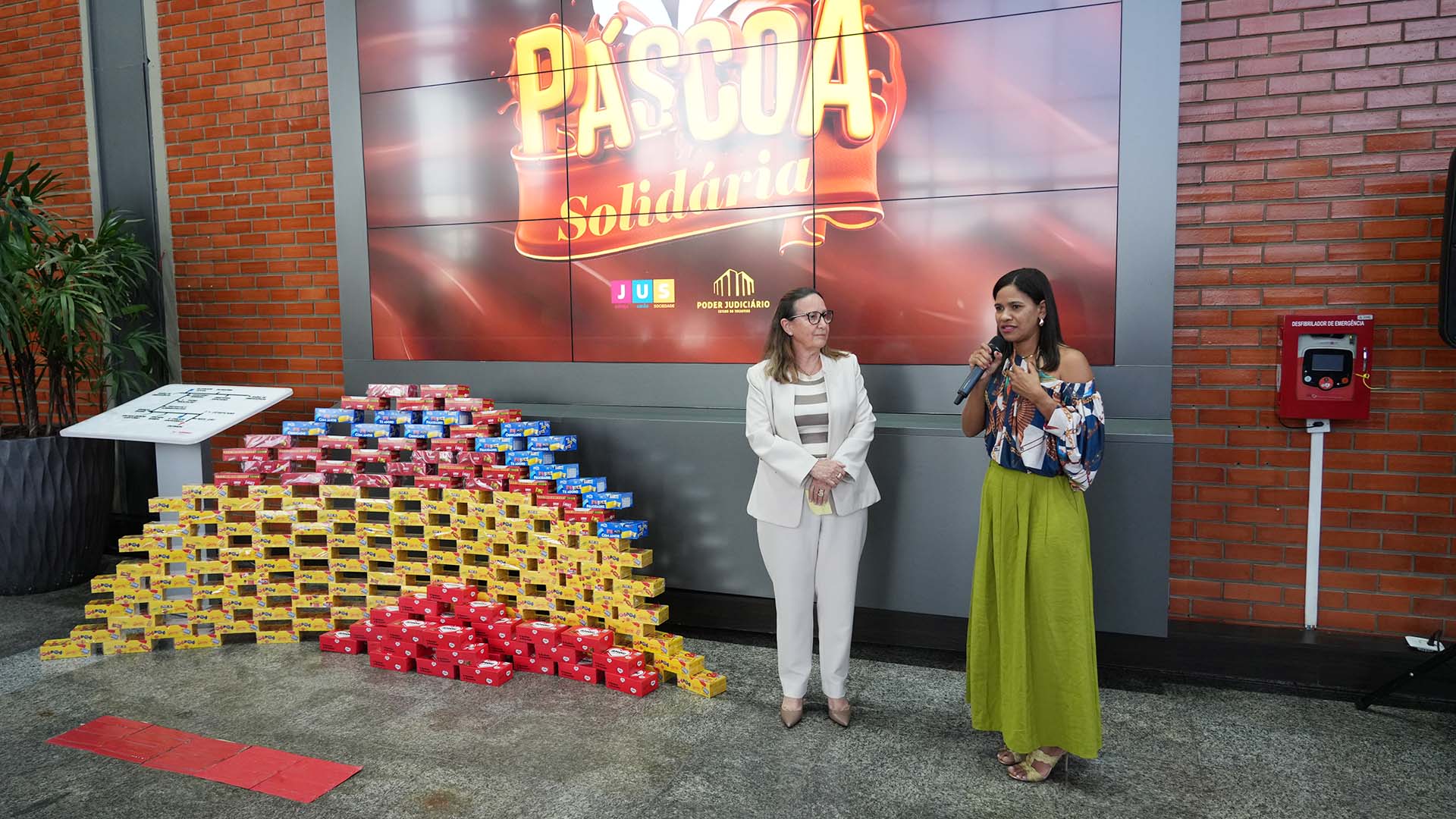 Desembargadora Maysa à esquerda e a diretora da escola estão posicionadas em frente a uma grande tela, que exibe uma mensagem de Páscoa Solidária. Elas seguram uma caixa de chocolate e ao fundo delas, no chão, aparece uma grande quantidade de caixas de chocolate empilhada.