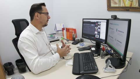 Fotografia colorida onde um senhor branco, de camisa verde e cabelos e barba grisalhos está sentado em uma cadeira em frente a um computador, que possui três telas, em cima de uma mesa de madeira clara com diversos objetos como celular, canetas e papeis