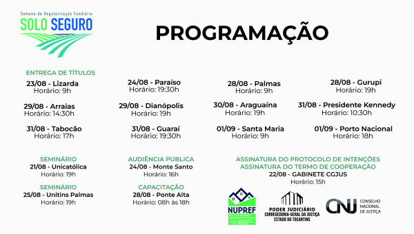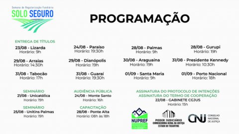 Ainda durante a semana, no dia 22 de agosto haverá assinatura de Protocolo de Intenções entre a CGJUS e a Superintendência de Patrimônio da União (SPU); assim como assinatura de termos de cooperação com os municípios de São Bento e Bernardo Sayão. No dia 25 de agosto, nova edição do Seminário será realizada na Universidade Estadual do Tocantins (campus Palmas), às 19 horas; e no dia 28 tem capacitação de cadastro socioeconômico no município de Ponte Alta