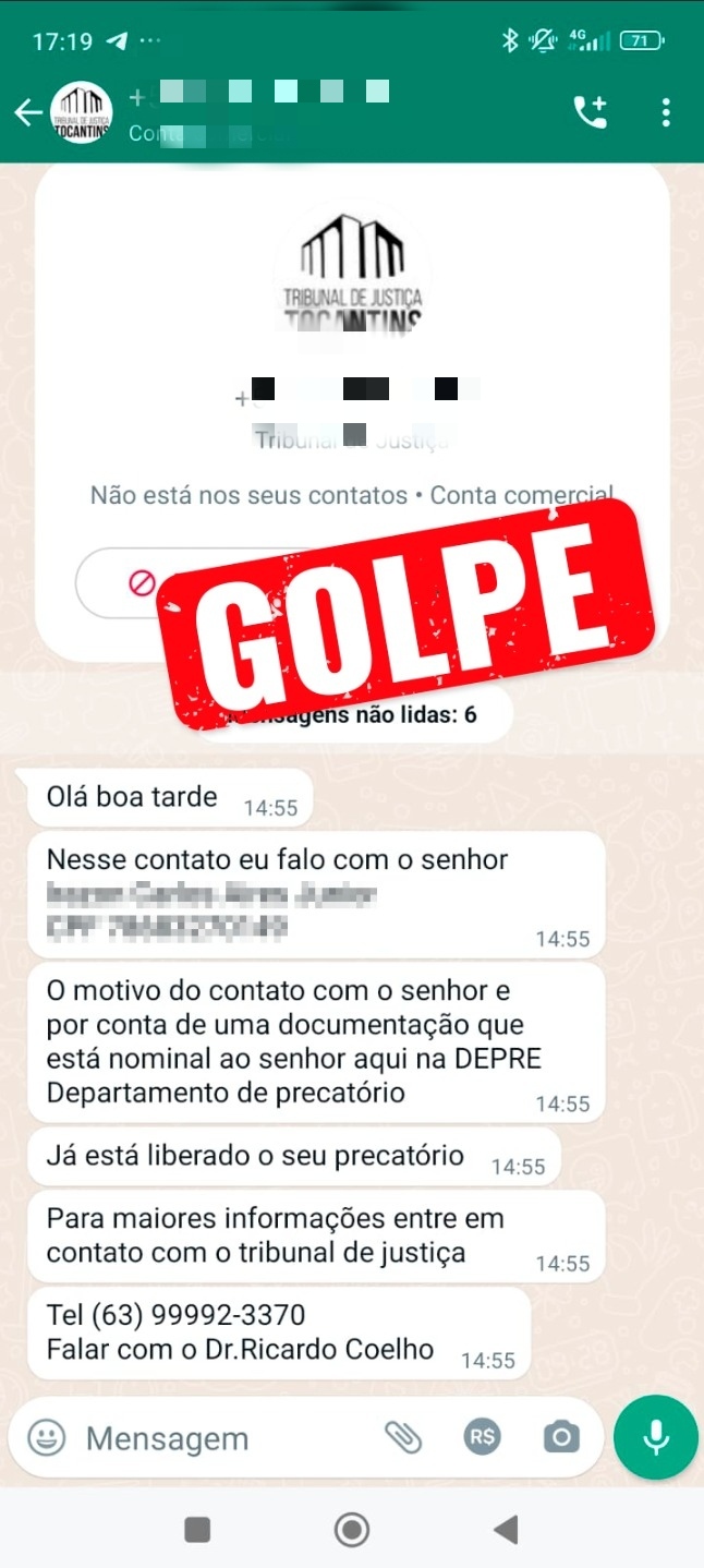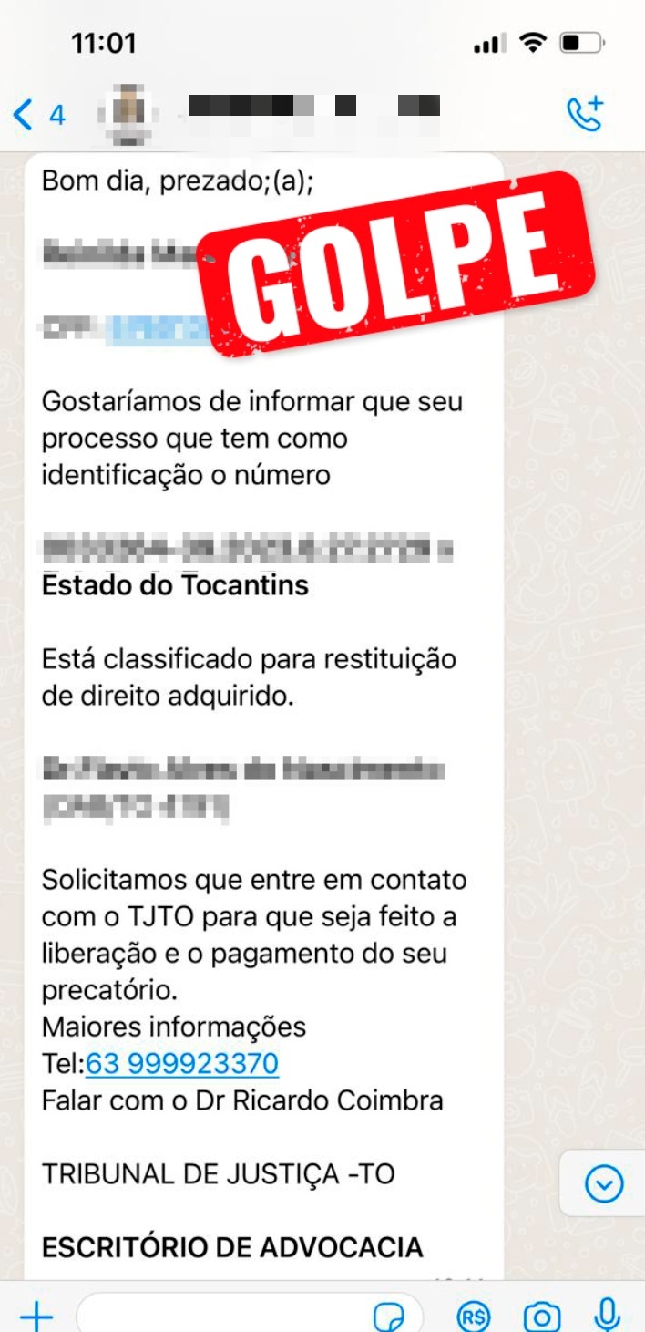 Segundo o Núcleo de Inteligência Institucional do TJTO (NIS), nas últimas semanas, começaram a circular mensagens pelo WhatsApp informando ao cidadão (ã) que há um precatório ou RPVs (Requisições de Pequenos Valores) liberado em nome da suposta vítima. Na abordagem, o golpista entra em contato usando diferentes números de celular diferente, se passando pela advogada “Dra. Samanta” ou pelo procurador do estado “Dr. Ricardo”, os golpistas usam um documento falso com o logomarca ou brasão do TJTO. Podem ainda utilizar outros nomes.
