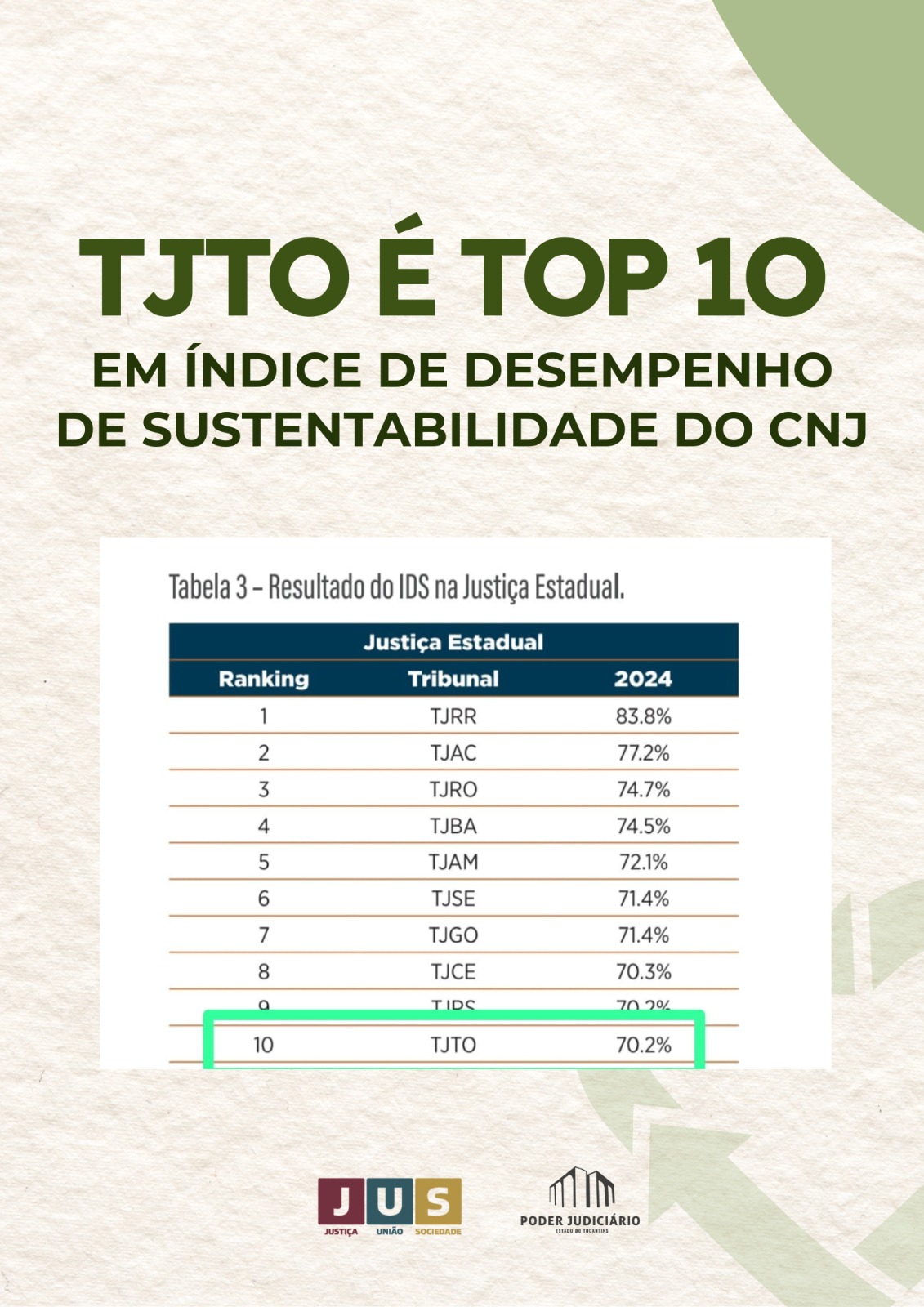 O relatório 9º Balanço da Sustentabilidade do Poder Judiciário lançado pelo Conselho Nacional de Justiça (CNJ) durante a 3.ª edição do Judiciário Sustentável realizado nesta segunda-feira (30/6) em Brasília colocou o Tribunal de Justiça (TJTO) entre os dez tribunais estaduais melhor ranqueados no índice de desempenho de sustentabilidade (IDS).