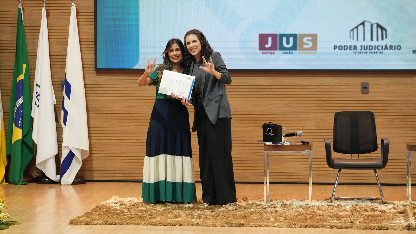 À esq. de vestido, a secretária-executiva da CPAI, Patrícia Idehara, faz sinal universal "Eu te amo" durante entrega de certificado da palestra “A pessoa surda e o Judiciário", da servidora surda do TRF5-SJPB, Clarissa Gomes, realizada no Encontro Judiciário Inclusivo