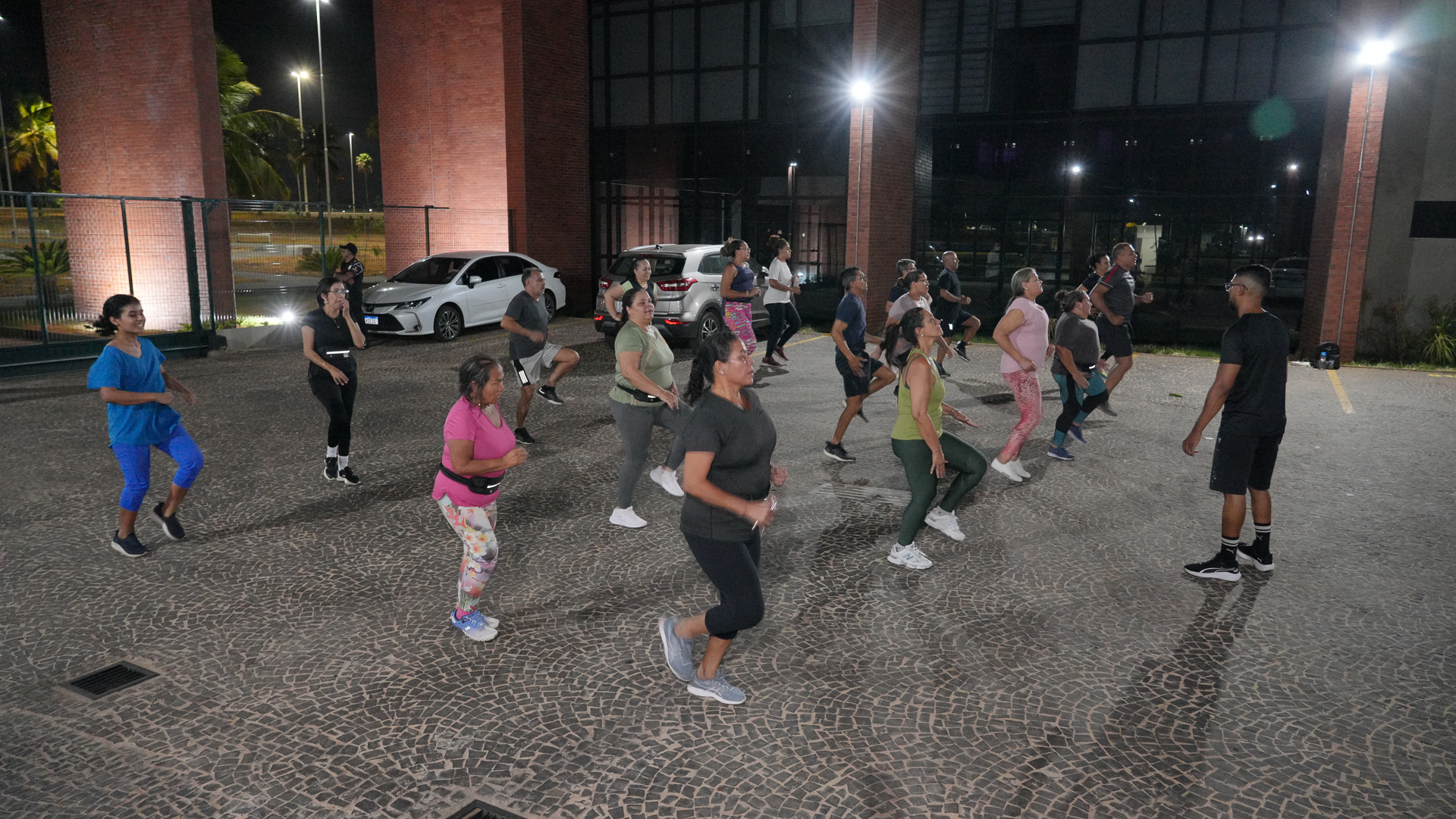 Lucas Nascimento A foto mostra um grupo de pessoas participando de uma atividade física coletiva ao ar livre, provavelmente em frente ao prédio do TJTO. Elas estão alinhadas em fileiras, executando o movimento de agachamento, com os braços estendidos à frente. O ambiente é noturno, iluminado por refletores, e o piso é de pedras portuguesas.