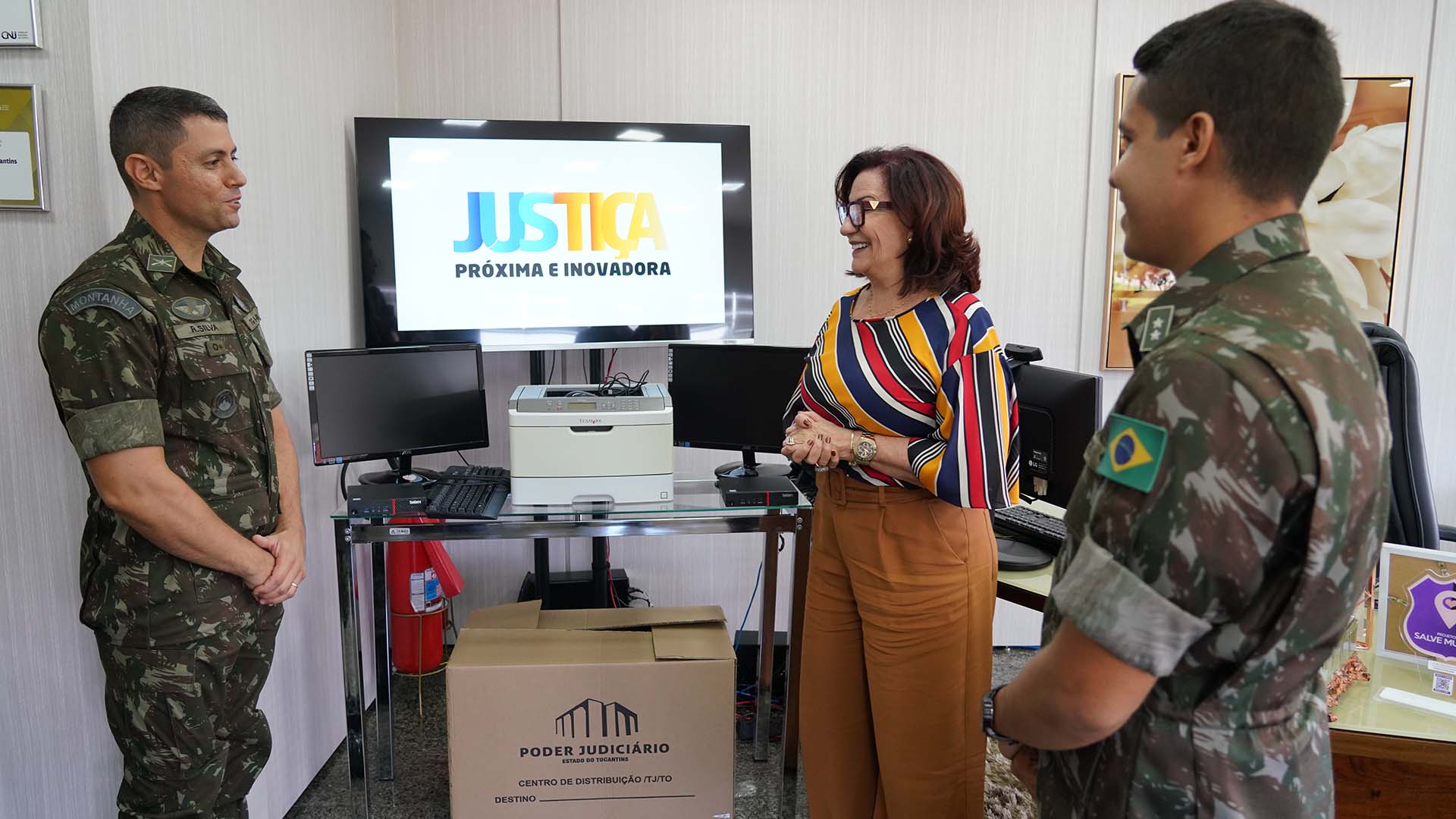 Cinquenta itens de informática vão reforçar o trabalho desenvolvido pelo Tiro de Guerra 11-008 de Miracema do Tocantins. Os equipamentos, doados pelo Tribunal de Justiça do Tocantins (TJTO) ao 22º Batalhão da Infantaria, foram entregues nesta quinta-feira (15/2) pela presidente do TJTO, a desembargadora Etelvina Maria Sampaio Felipe, aos representantes do Exército, 1º tenente Raphael Augusto Amaral Silva e 1° sargento Rafael Rodrigues Silva.