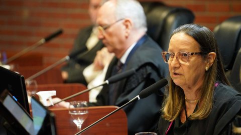 Desembargadora Etelvina conduzindo a sessão; ela fala ao microfone