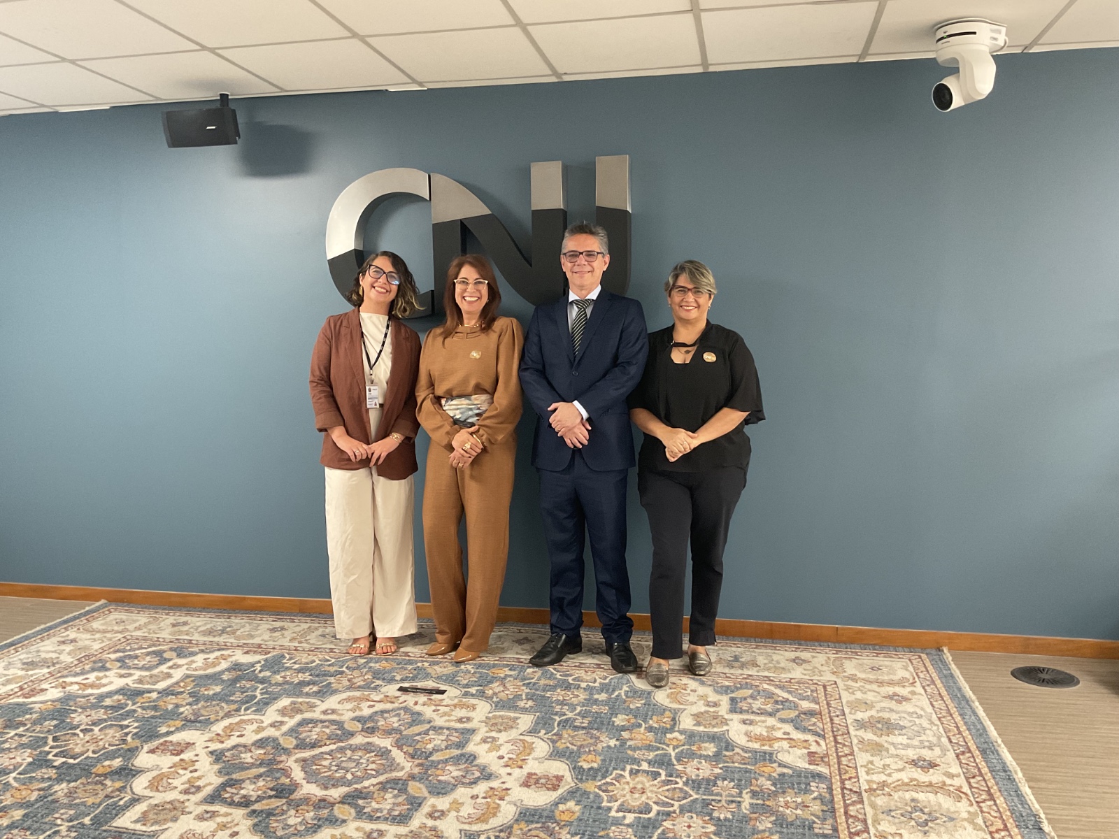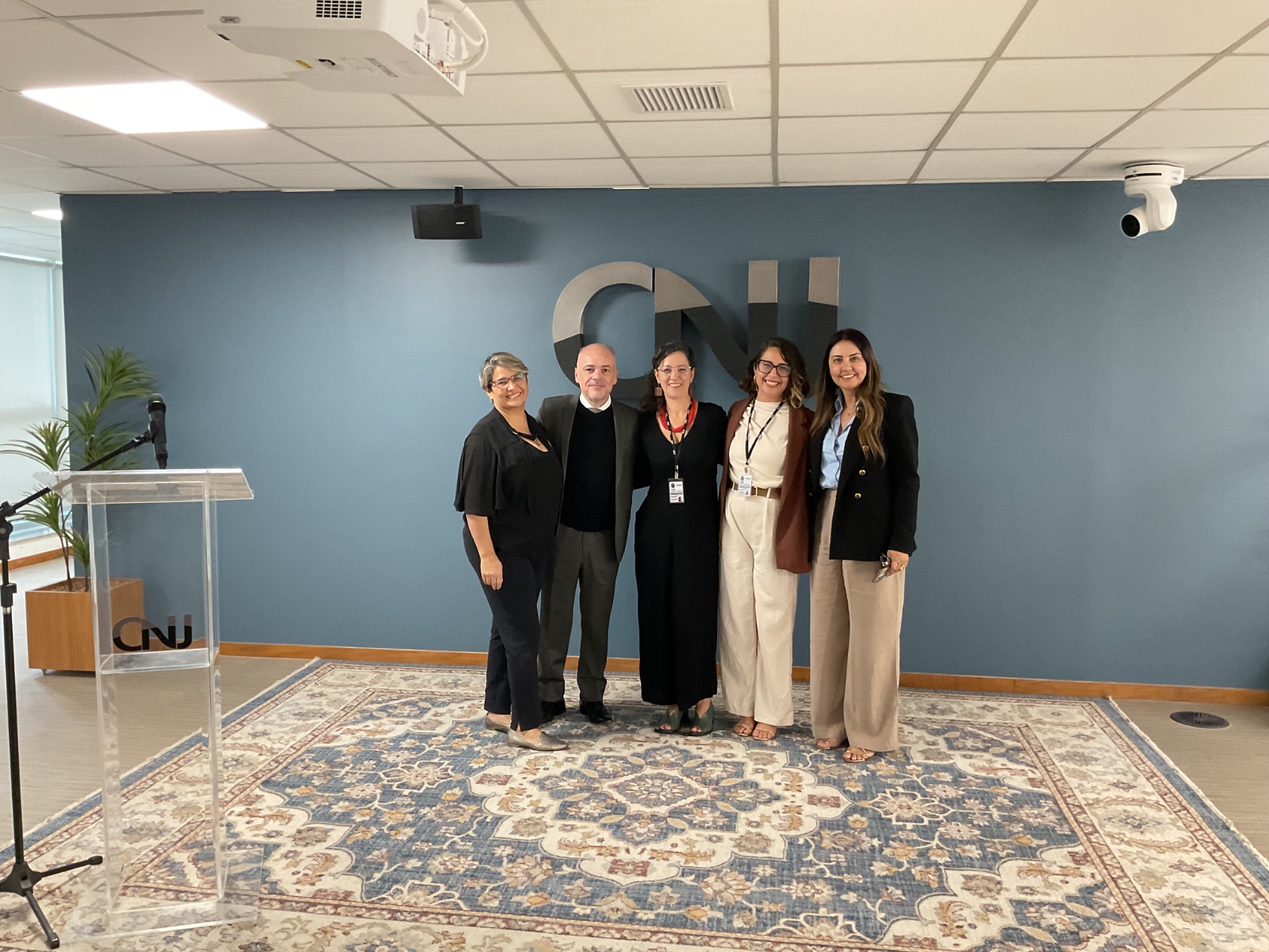 Divulgação A imagem mostra uma mesa de autoridades durante um evento no Conselho Nacional de Justiça (CNJ). O ambiente é uma sala ampla, moderna, com paredes revestidas em madeira clara e teto com iluminação branca distribuída em painéis retangulares.  Ao centro, há uma mesa comprida coberta com um forro azul-marinho com o logotipo do CNJ e a marca de 20 anos. Sentados lado a lado, estão sete participantes, todos vestidos de forma formal — ternos e roupas sociais. Eles estão posicionados frente ao público, cada um com um microfone e copos de água à disposição.
