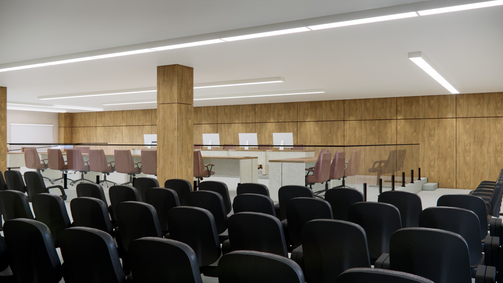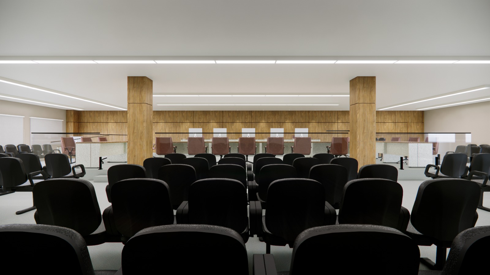 No Salão do Júri, o palco foi ampliado e o layout reorganizado para garantir melhor fluxo entre magistrado, jurados, partes e testemunhas. A capacidade de público foi mantida, com 165 assentos.