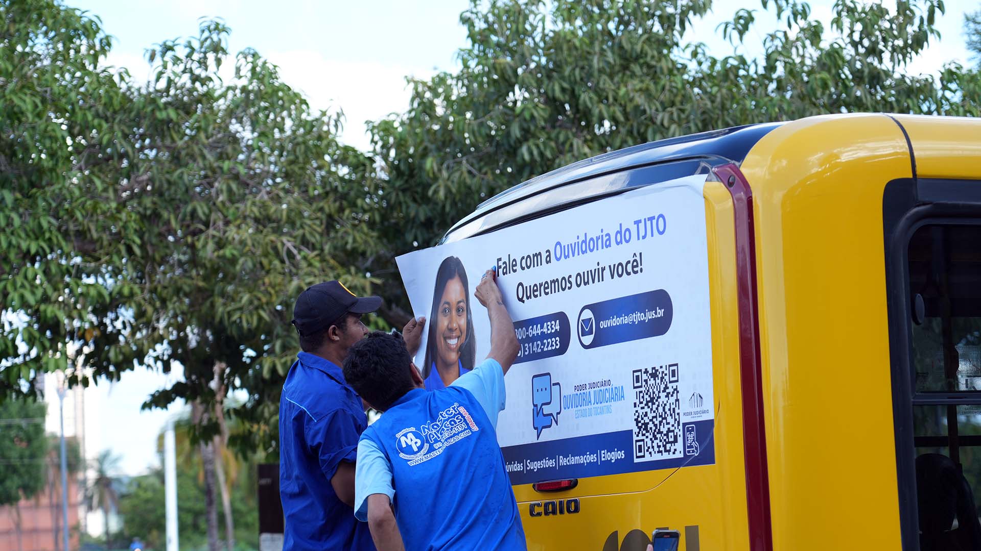 O Tribunal de Justiça do Tocantins (TJTO) lançou, na tarde desta quinta-feira (13/11), a campanha que leva os canais de comunicação da Ouvidoria Judiciária para as ruas da capital, por meio da mídia busdoor. Em parceria com a Prefeitura de Palmas, os primeiros ônibus de transporte coletivo receberam adesivos instalados no para-brisa traseiro, bem como no interior dos veículos.