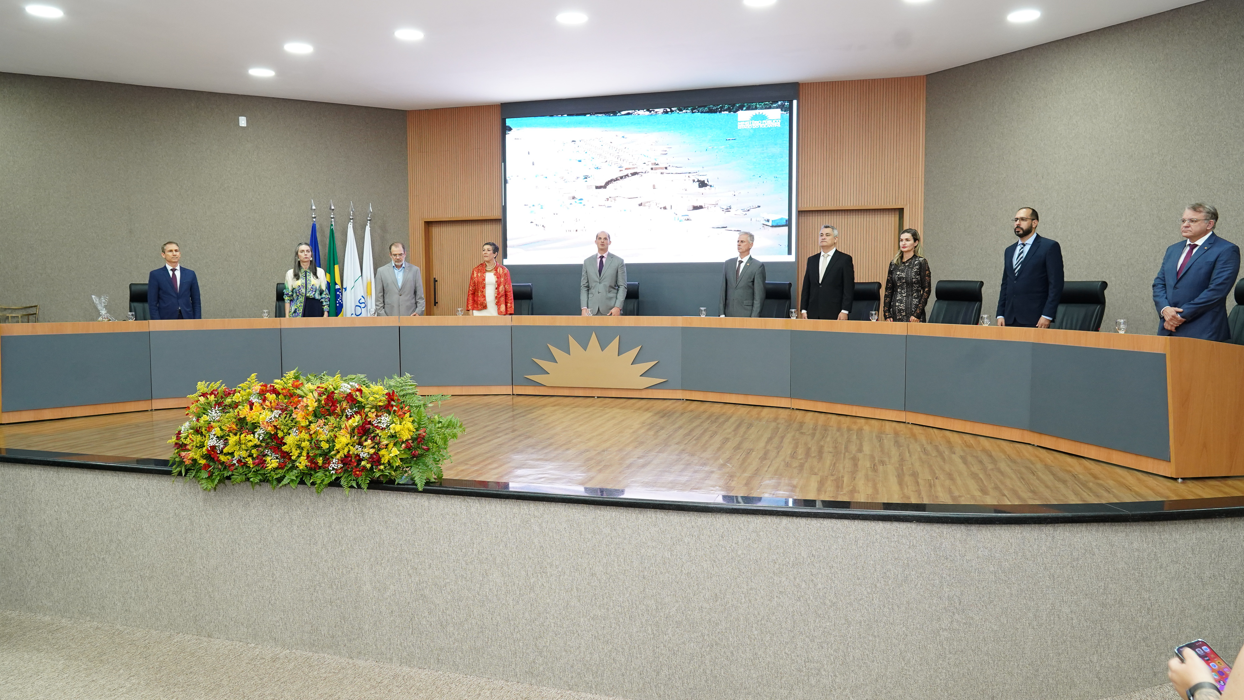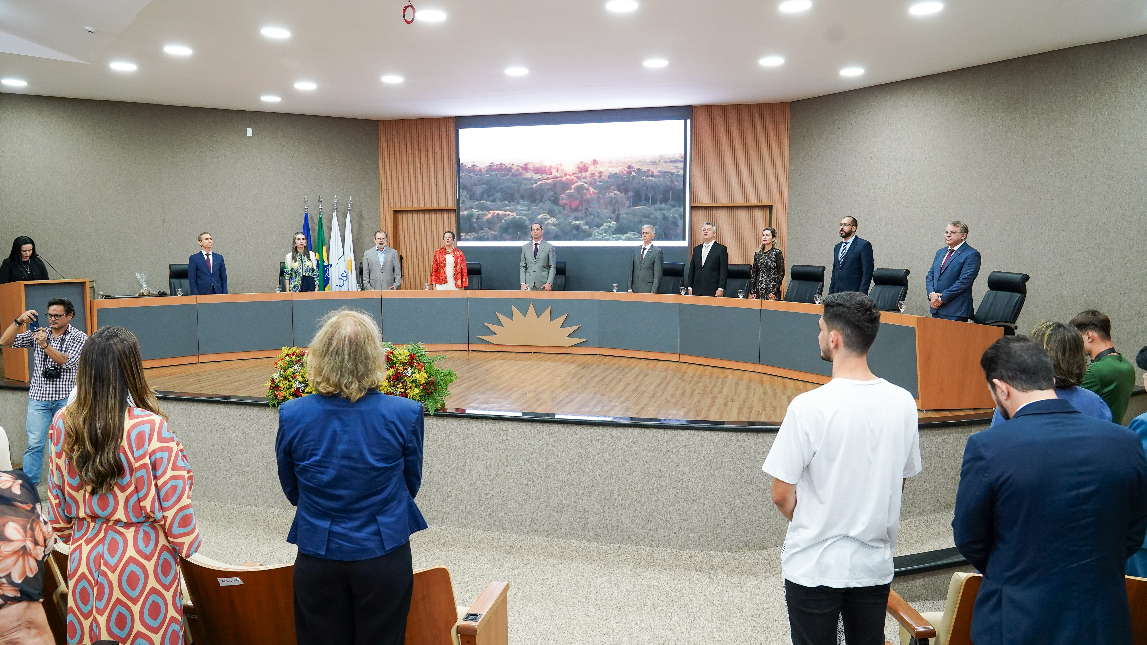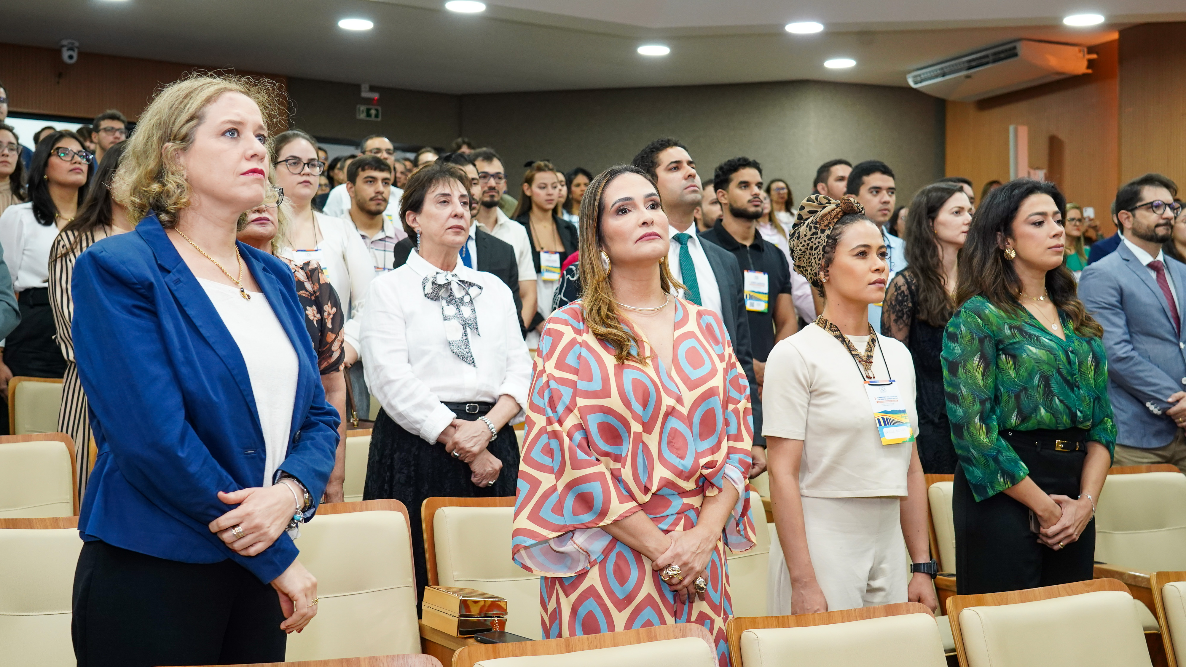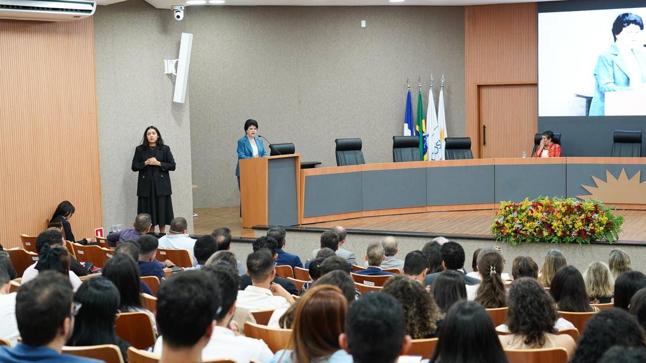 Francisca Coelho/ Dicom MPTO Na imagem, vê-se um auditório com público sentado enquanto uma cerimônia oficial acontece no palco. Uma mesa de honra com diversas autoridades está disposta ao fundo, e uma oradora fala ao púlpito, com uma intérprete de Libras posicionada à esquerda. Um fotógrafo registra o momento, e um telão ao fundo projeta a imagem da fala.