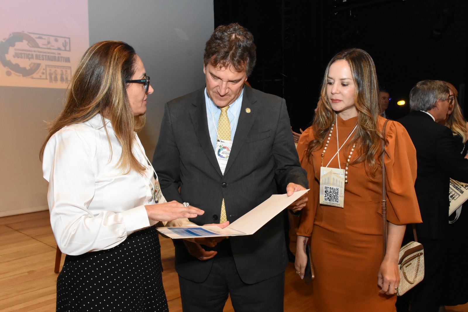 Divulgação Quatro participantes posam para foto durante o congresso de Justiça Restaurativa. Duas mulheres e um homem vestem trajes formais e utilizam credenciais do evento; ao centro, o homem está de terno escuro e gravata amarela. Uma das participantes segura uma pasta com a identidade visual do congresso, enquanto outra traz uma bolsa temática do evento.  Ao fundo, há a projeção de um QR code na tela do auditório, reforçando o ambiente institucional e acadêmico da ocasião.