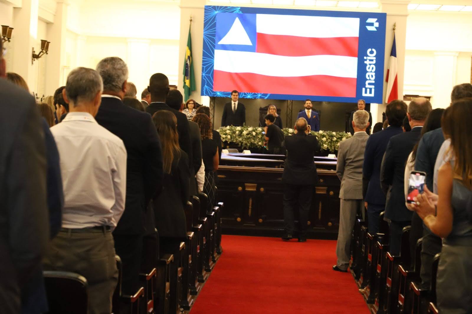 TJBA A imagem mostra muitas pessoas sentadas em fileiras em um salão amplo. O espaço central é ocupado por mesas em forma de semicírculo e algumas pessoas em pé.