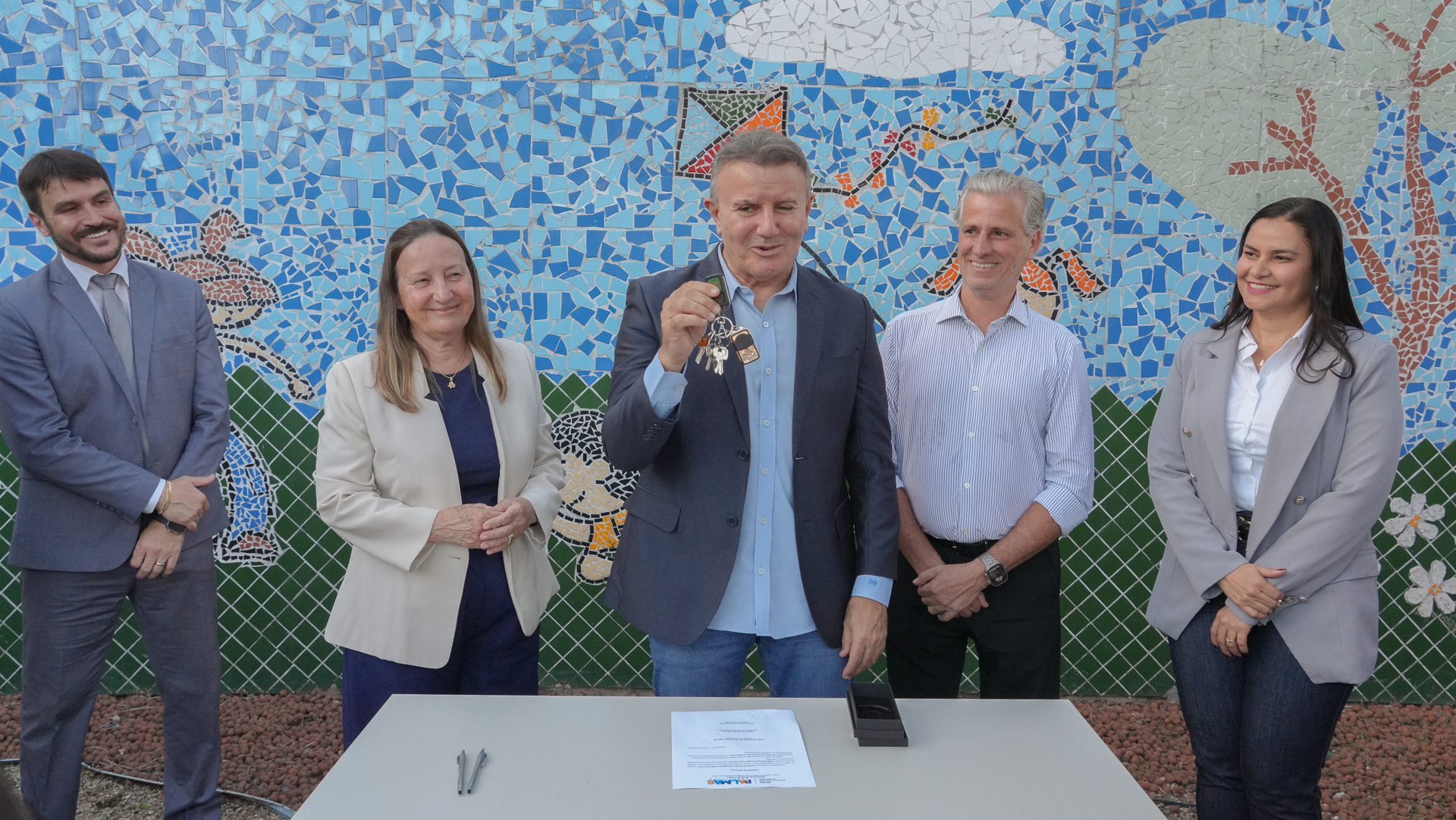 Lucas Nascimento Grupo de autoridades posa para foto durante entrega institucional, segurando documentos e uma chave simbólica. Ao fundo, um mural colorido em mosaico