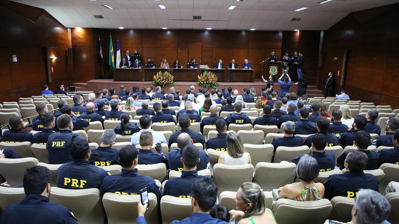 Elias Oliveira Imagem mostra auditório lotado com pessoas sentadas e à frente uma mesa com autoridades prestigiando posse do superintendente da PRF