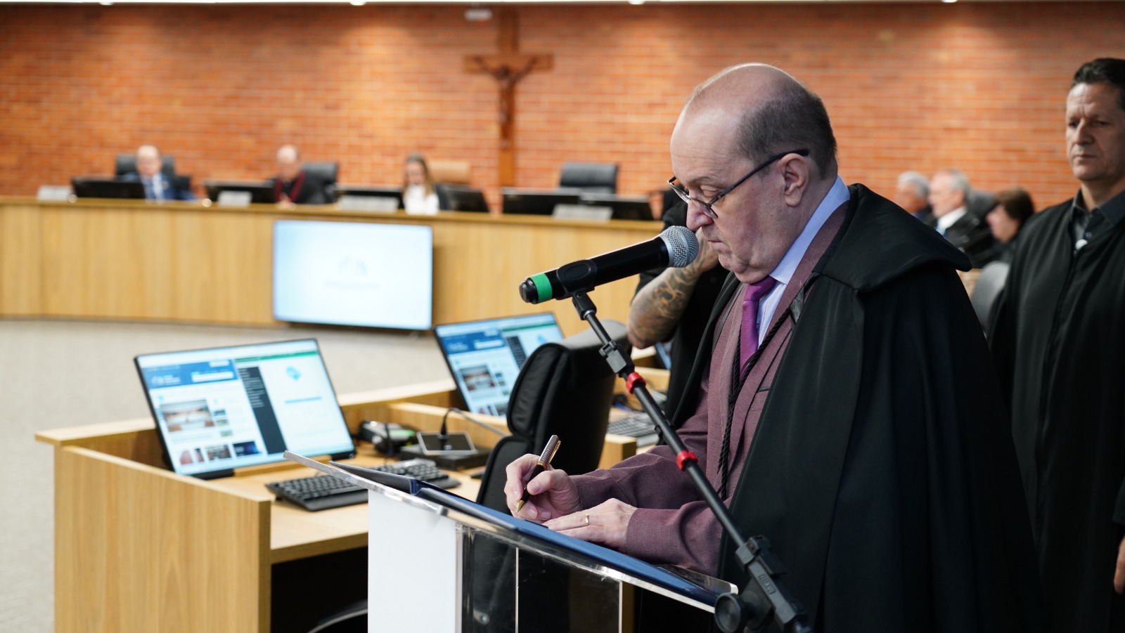 "Convoco todos vocês para honrarmos e dignificarmos, para abrilhantar com a evolução nos estudos no aperfeiçoamento, na dedicação, na jurisdição e na construção de um tribunal cada vez mais justo, mais coeso, que prestigie os princípios constitucionais, e que possa trazer estabilidade jurídica e as garantias constitucionais necessárias para que o Tocantins floresça”, complementou.
