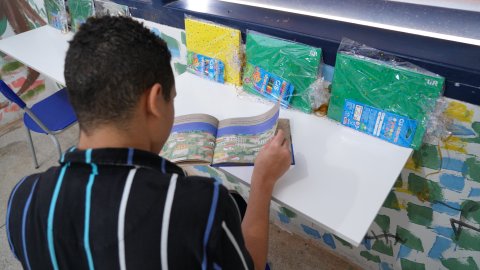 Um adolescente sentado à mesa lê um livro aberto. À frente, sobre a bancada branca, há kits escolares embalados com cadernos e caixas de lápis de cor. O ambiente é interno, com parede pintada ao fundo e iluminação artificial.