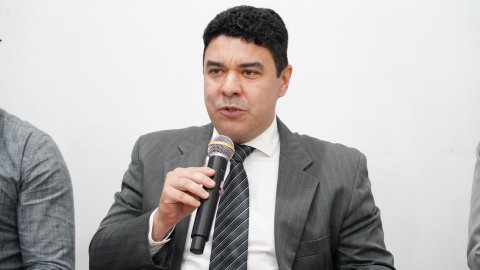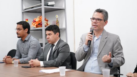 Fotos: Elias Oliveira Pessoas sentadas em cadeiras organizadas em auditório acompanham reunião institucional. À frente, uma mesa com autoridades e convidados sentados, sendo um dos participantes em pé falando ao microfone. O ambiente é interno, com banners institucionais ao fundo e instrumentos musicais apoiados na parede lateral.