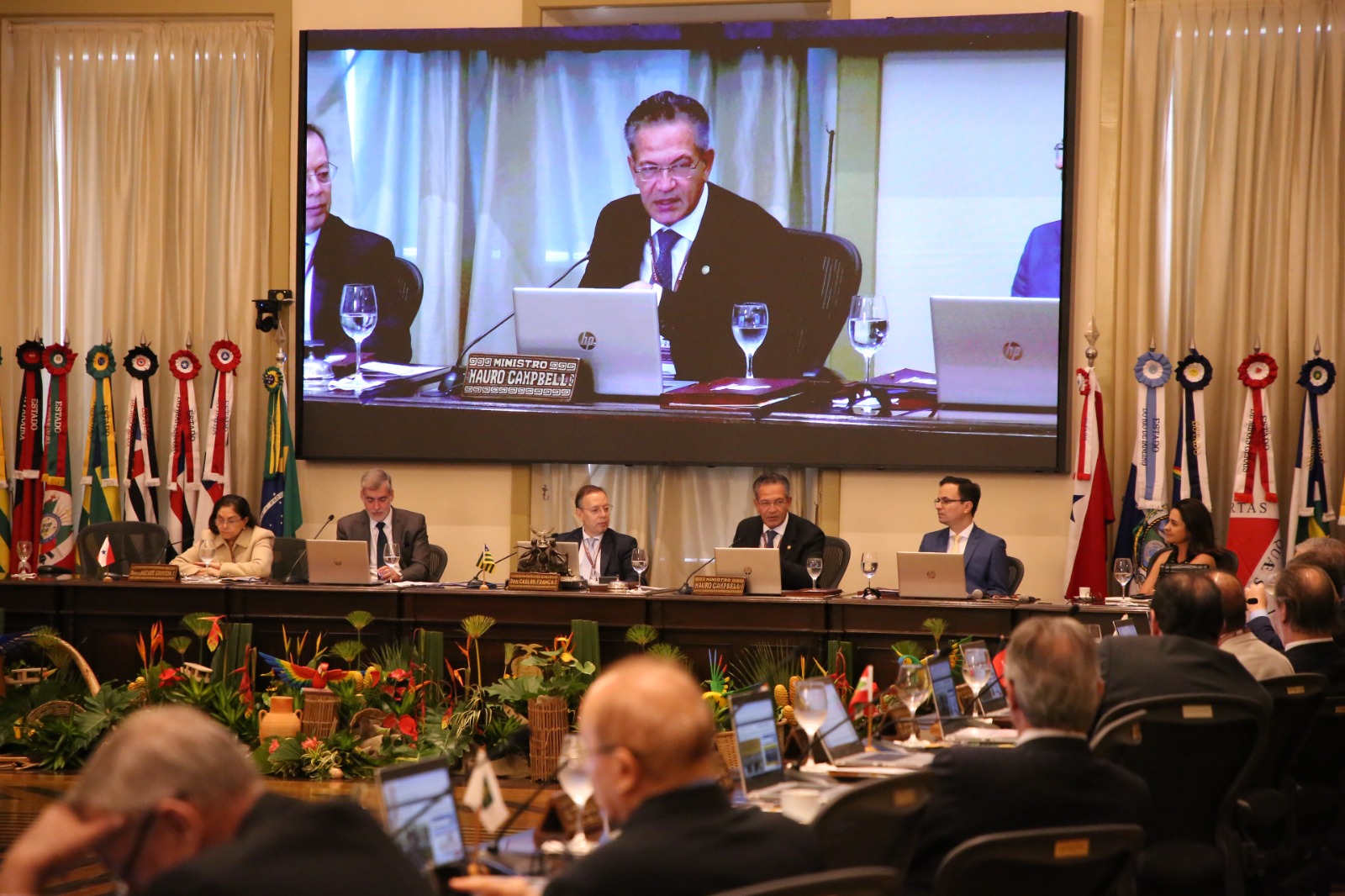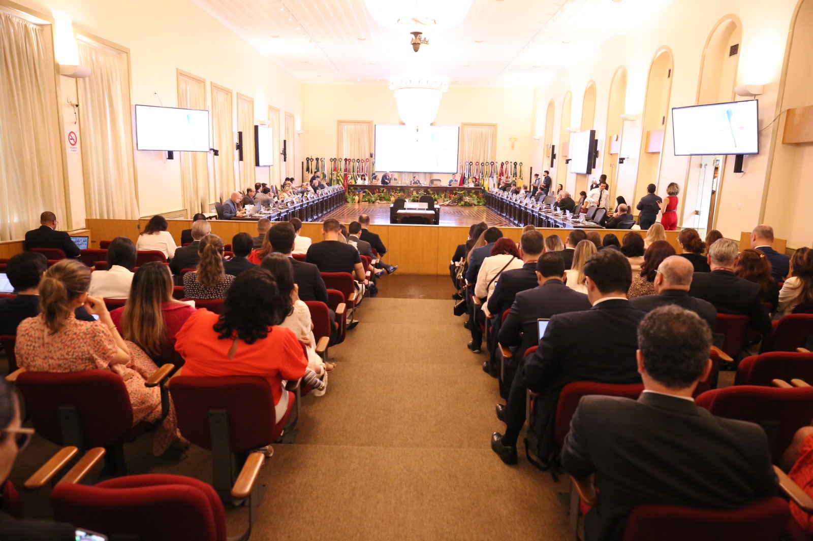 Elias Oliveira Imagem de uma grande sala com um audtório em primeiro plano, onde estão pessoas sentadas, asistindo a programação ao fundo, onde estão reunidos os desembargadores
