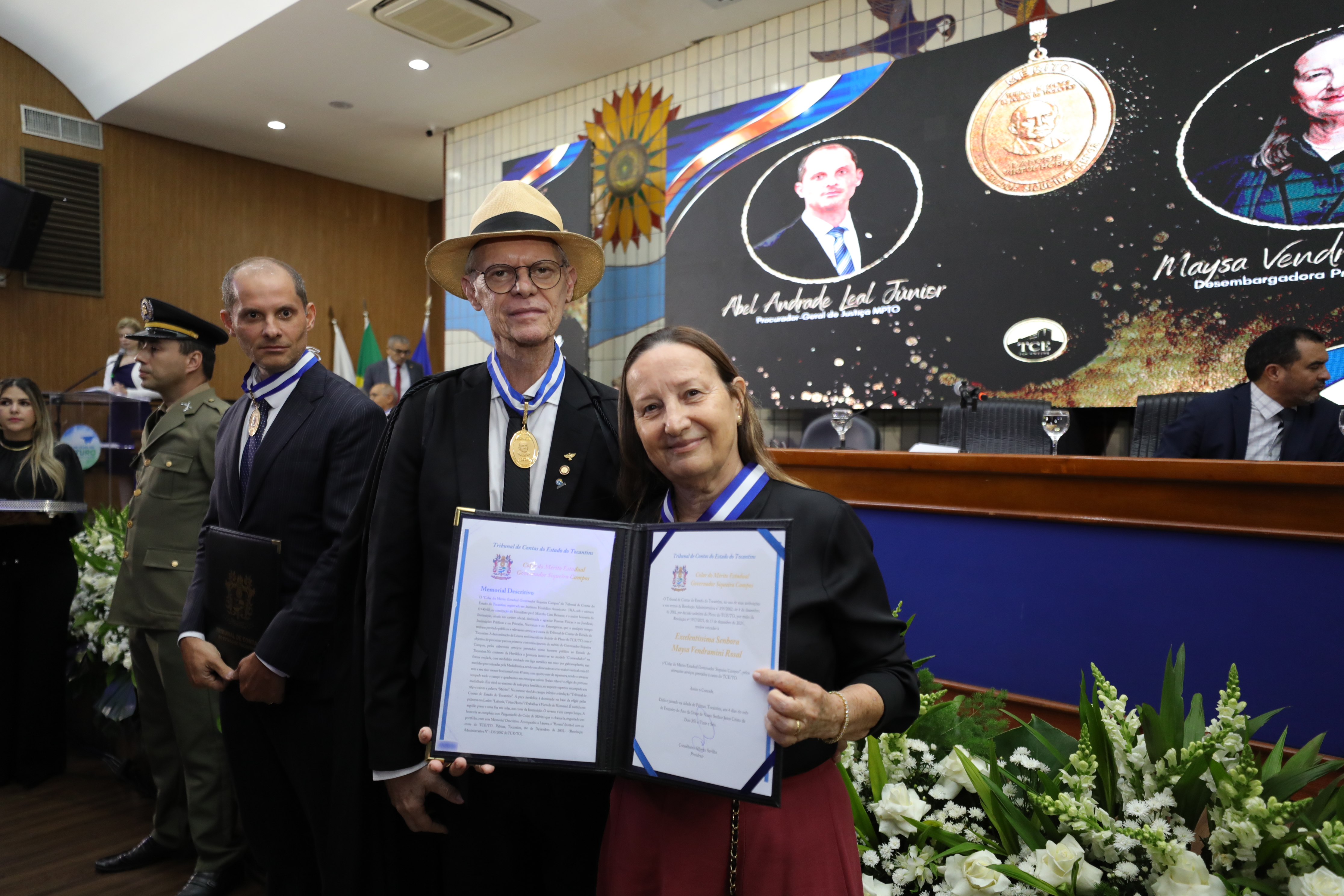Sessão solene em plenário judicial, com magistrados e autoridades de pé ao redor de mesa semicircular, câmera em tripé no centro do espaço e arranjo floral à frente. Ambiente interno amplo, com iluminação no teto e público presente.