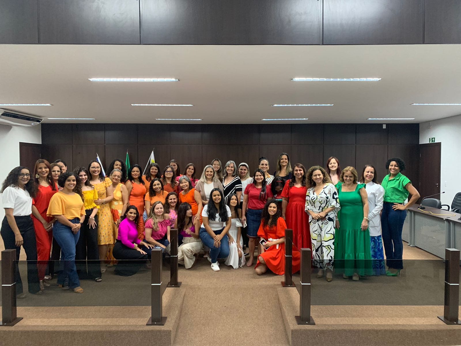 Servidoras da comarca de Araguaína reunidas e posando para foto no auditório do Foro