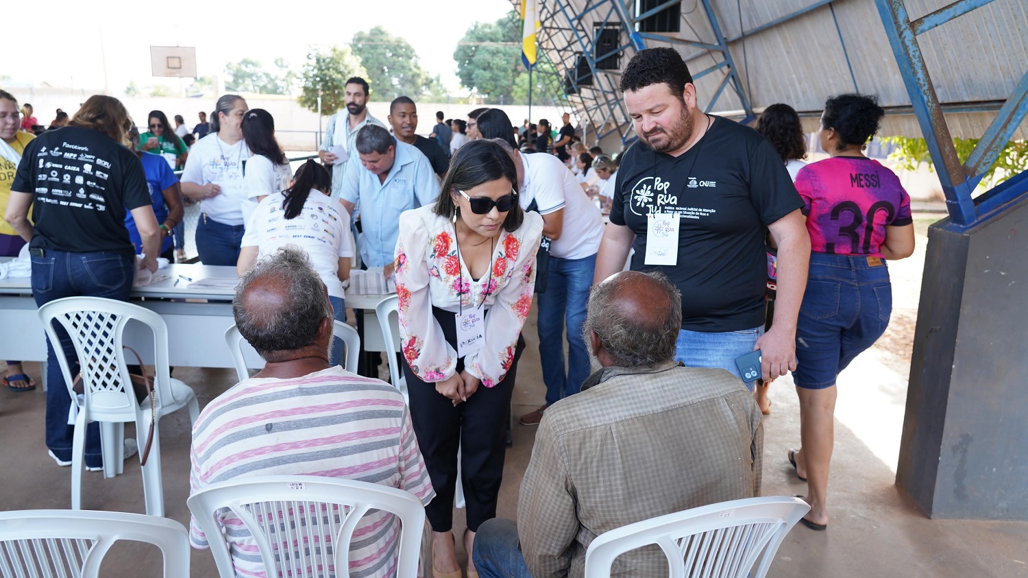 Rondinelli Ribeiro/Cecom/TJTO Imagem mostra pessoas sentadas em frente às mesas de triagem atendidas por voluntários do mutirão Pop Rua Jud
