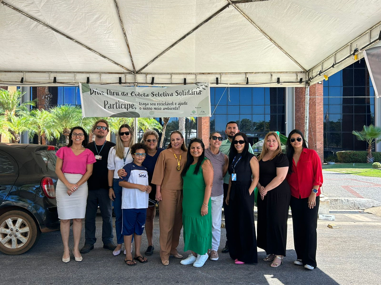 Equipe do TJTO recepciona doador de resíduo sob a tenda do 4º Drive-Thru de Coleta Seletiva Solidária