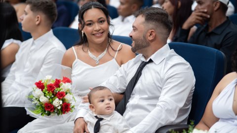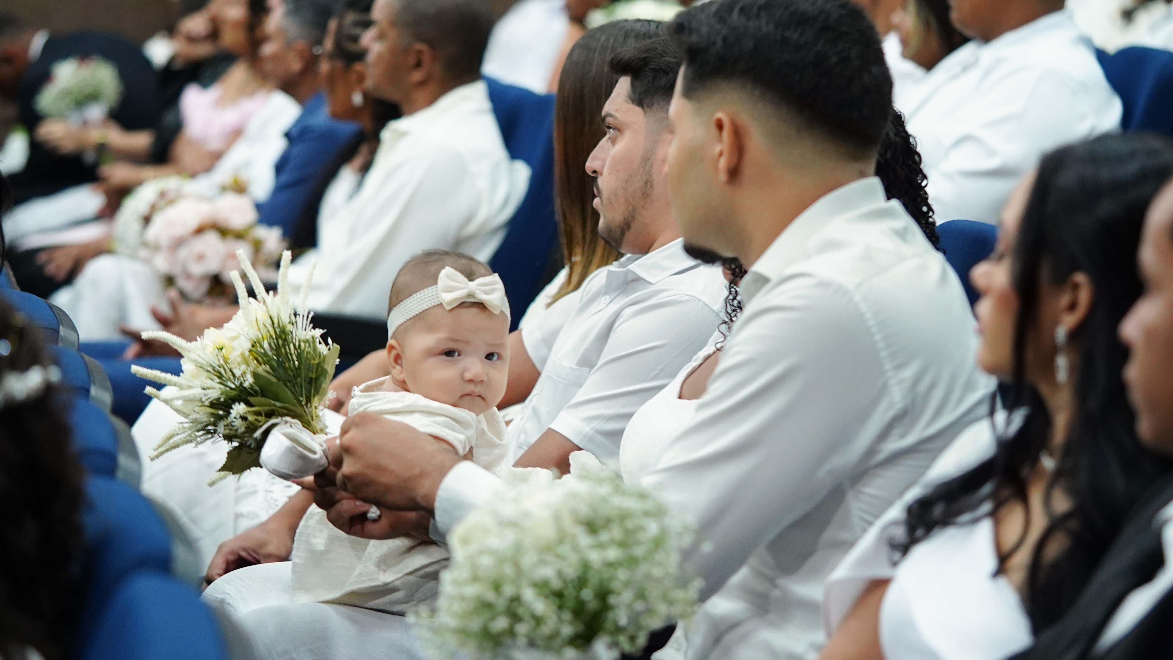 “Entrar com nosso filho, de cinco meses, nos braços, foi um sonho realizado”, contou emocionada a noiva Bruna Vieira Leite, de 28 anos, que trocou alianças com Nermison Alves Leite, de 38, durante a 6ª edição do Casamento Comunitário da Comarca de Araguaína, realizado no último sábado (4/10). O casal, junto há três anos, celebrou o amor em um dia repleto de histórias inspiradoras.