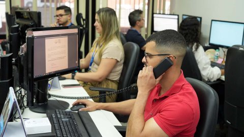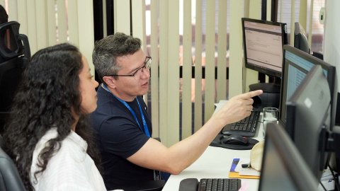 Rondinelli Ribeiro Imagem mostra vários servidores sentados em frente a computadores, na sala de trabalho.