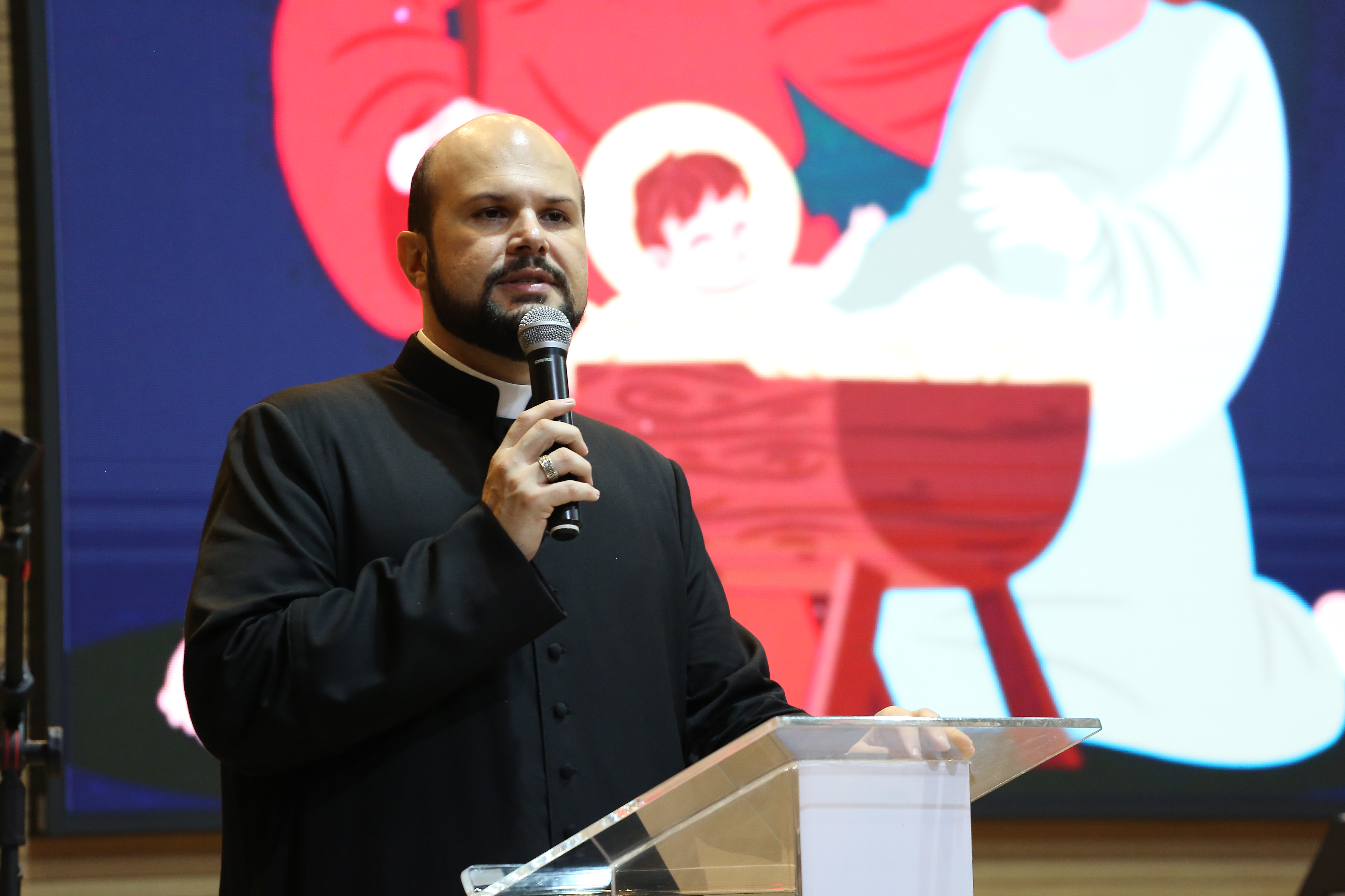 A celebração de Natal começou com a veiculação de um vídeo que trata sobre generosidade, felicidade. Em seguida, o padre da Catedral do Divino Espírito Santo, Eduardo Zanom, leu uma passagem bíblica (livro de João) e disse que o fim do ano é um momento de retrospectiva, “mas também de renovar a esperança do que está por vir”.