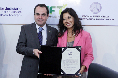 A conferencista recebeu o a medalha Jubileu de Prata em comemoração aos 25 anos do TJTO.