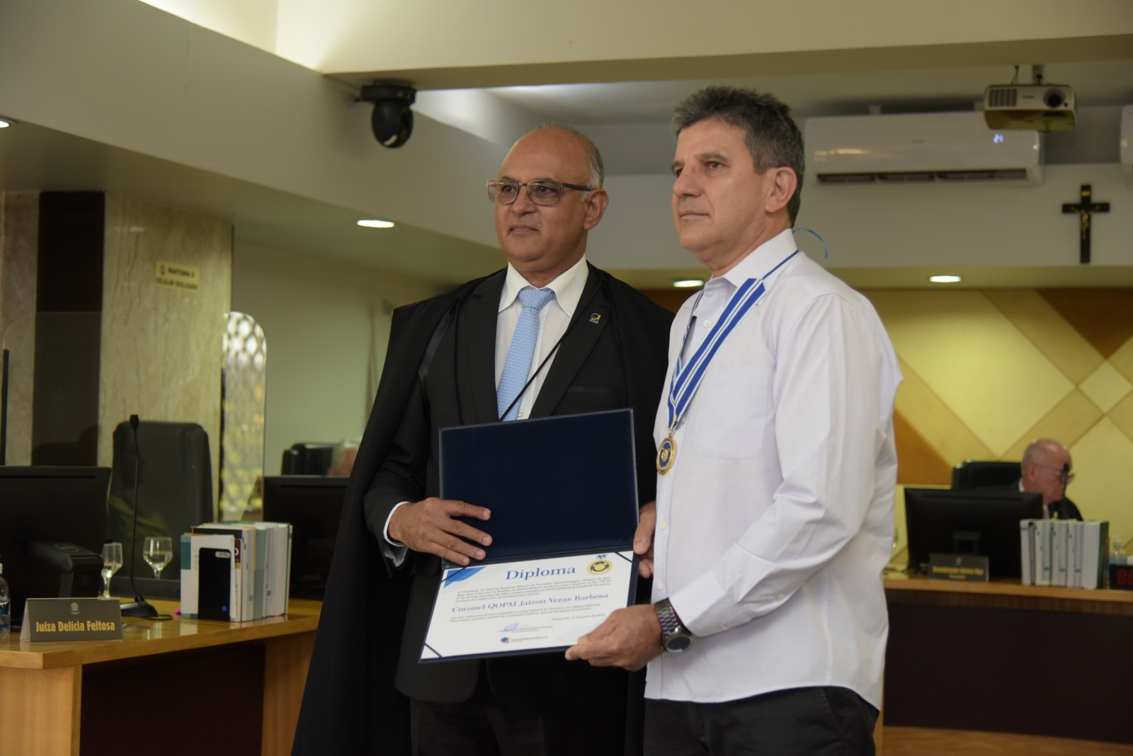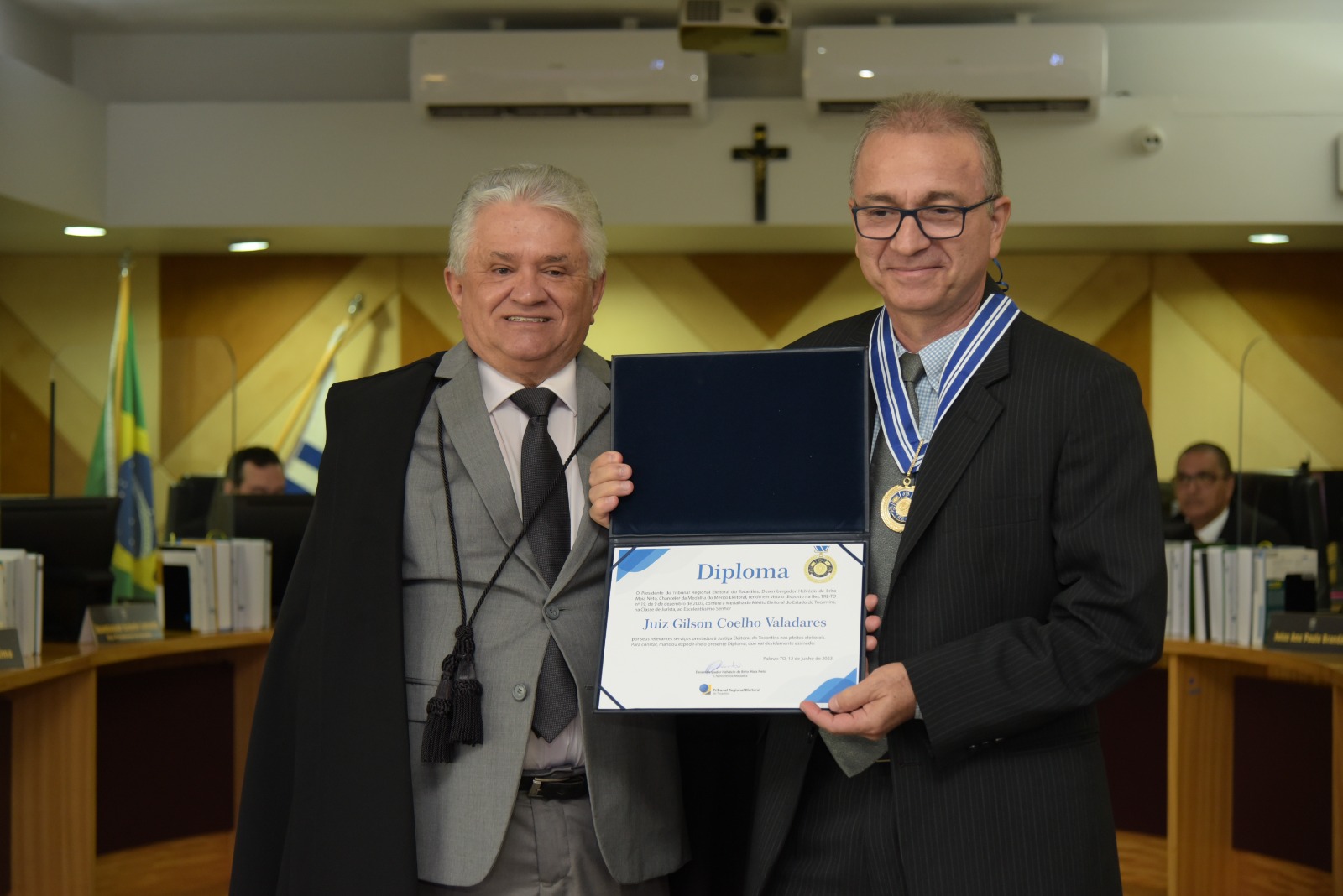 O assessor militar do Tribunal de Justiça do Tocantins (TJTO), coronel  da Polícia Militar, Jaizon Veras Barbosa, e o   juiz Gilson Coelho Valadares, receberam  Medalha e Diploma do Mérito Eleitoral, uma homenagem  aos profissionais e instituições que prestaram relevantes serviços à Justiça Eleitoral.