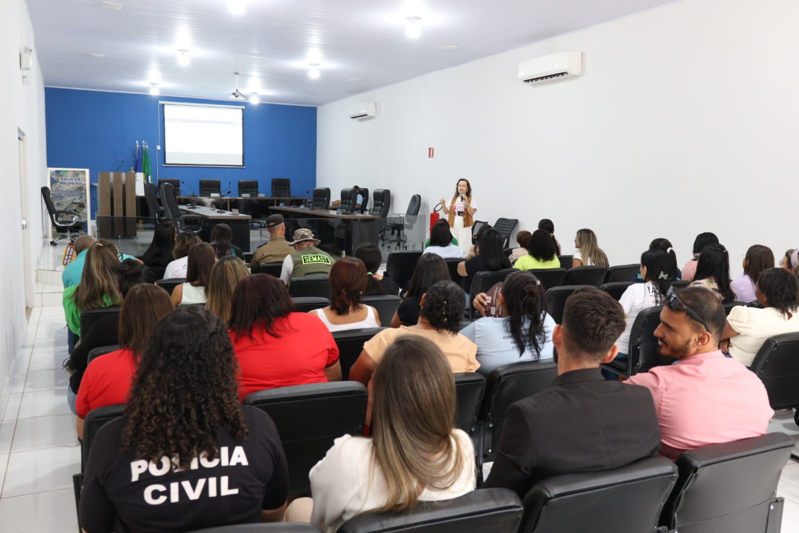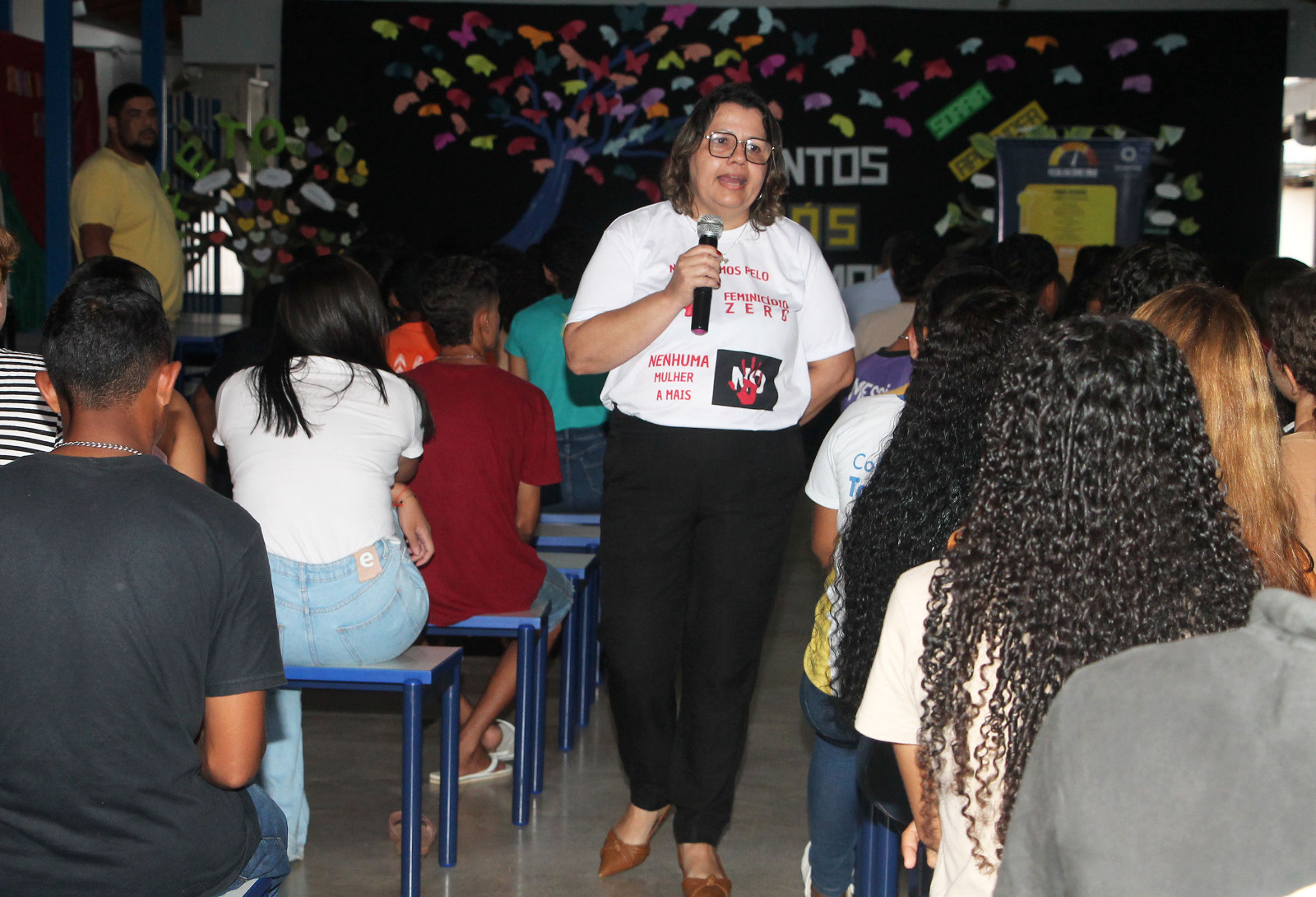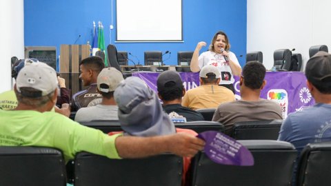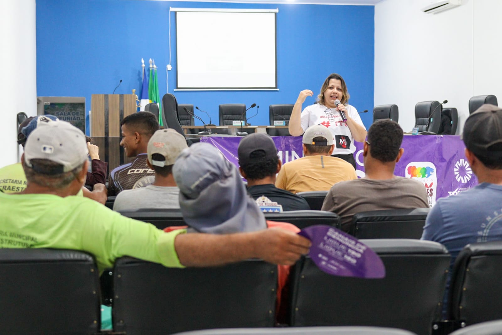 Divulgação Homens sentados de costas em cadeiras pretas em sala assistindo palestra de mulher de calça branca e blazer preto. Ela está de cabelos soltos, na altura dos ombros e microfone na mão, falando sobre Feminicídio, tema inscrito na faixa roxa atrás dela. Ao fundo, parede azul.
