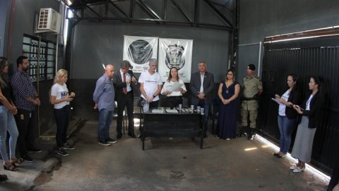 Lucas Nascimento (Corregedoria-Geral da Justiça) Fotografia colorida que mostra autoridades à frente de uma reunião e as reeducandas sentadas (se serem identificadas) ouvindo