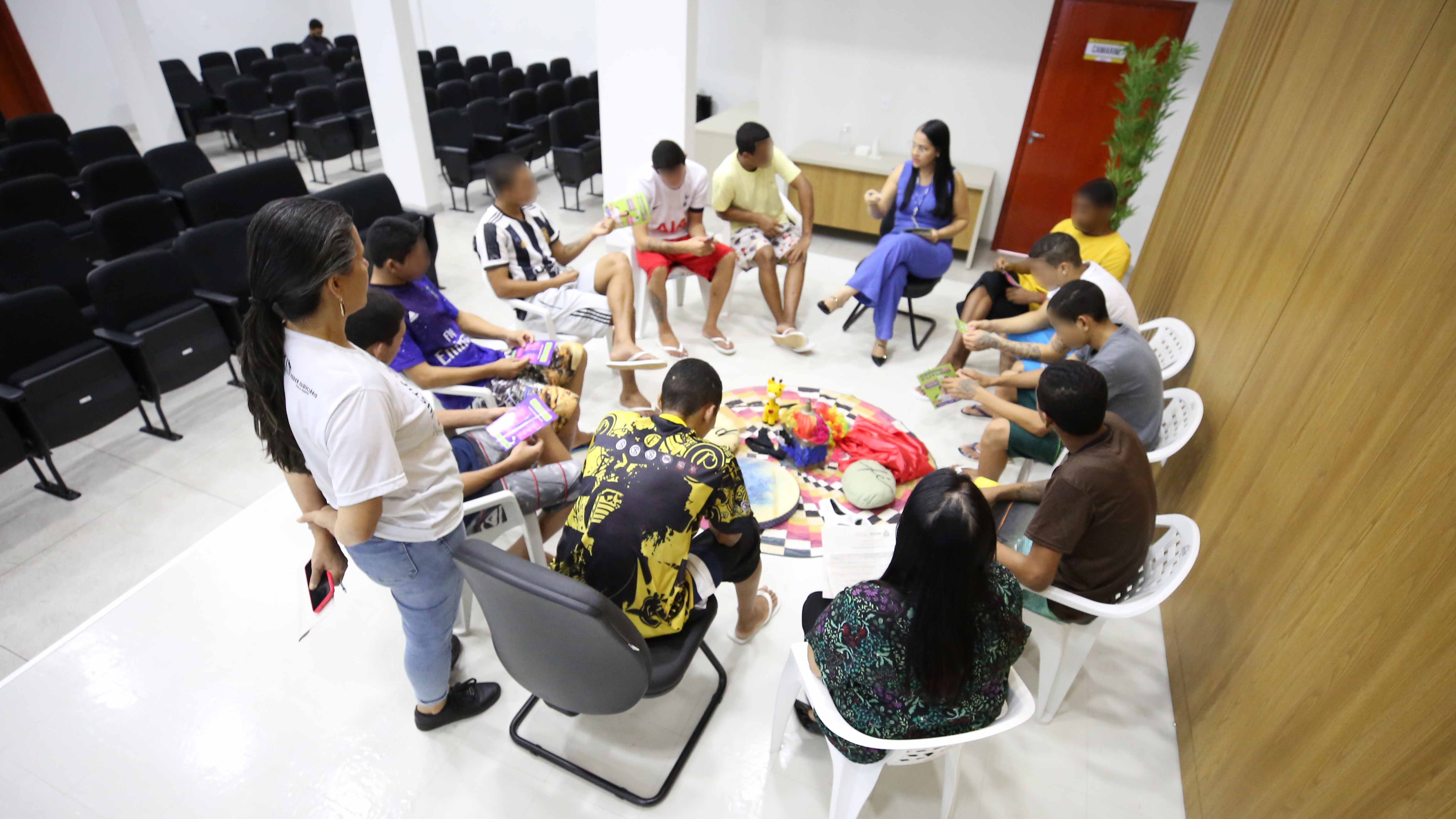 Durante as audiências, também estão sendo aplicadas, pela equipe do Poder Judiciário do Tocantins, técnicas da Justiça Restaurativa com os socioeducandos. Por meio do “Círculo para construção de paz”, busca-se a conscientização dos jovens sobre a importância deles cumprirem a medida socieducativa com tranquilidade. Para tanto, durante a ação, a facilitadora Luciane Rodrigues do Prado Faria, que é assessora da Coordenadoria da Cidadania da Corregedoria-Geral da Justiça, proporcionou momentos de reflexão, convivência e integração entre os participantes. Os adolescentes também participaram de um bate-papo com uma representante do Senai, que apresentou as opações que a instituição oferece e incentivou os jovens a fazerem cursos profissionalizantes.