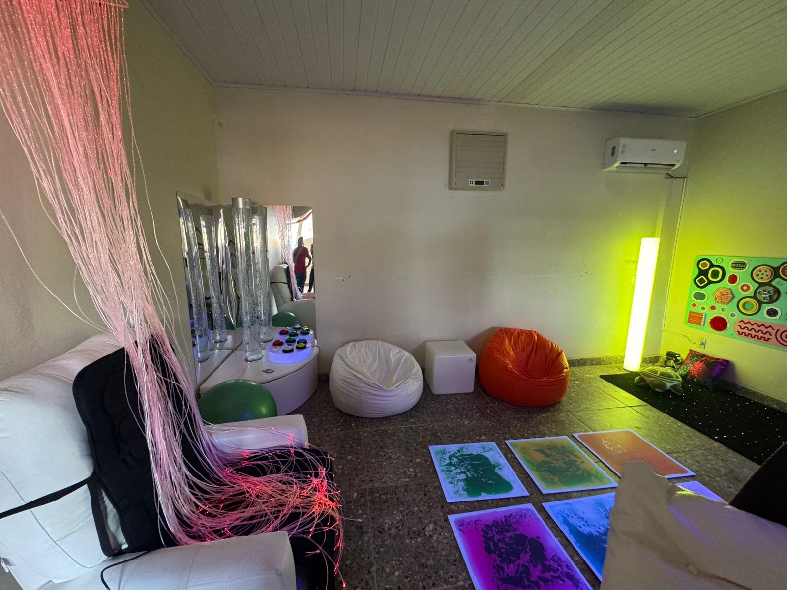 O espaço reúne equipamentos modernos e terapias integradas, como tubos de bolhas, fibras ópticas, piscina de bolinhas com LED, painéis interativos, piso líquido sensorial, poltronas vibratórias e balanço.