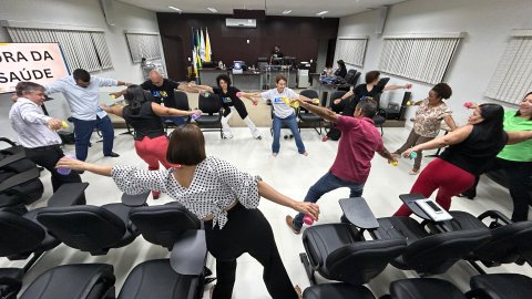 A fisioterapeuta do Centro de Saúde (Cesau/TJTO), Hozana Lopes, encerrou o encontro com uma sessão de ginástica laboral, auxiliada pelas fisioterapeutas credenciadas, Joice Kuhn e Zuleide Amaral, que atuam na comarca.