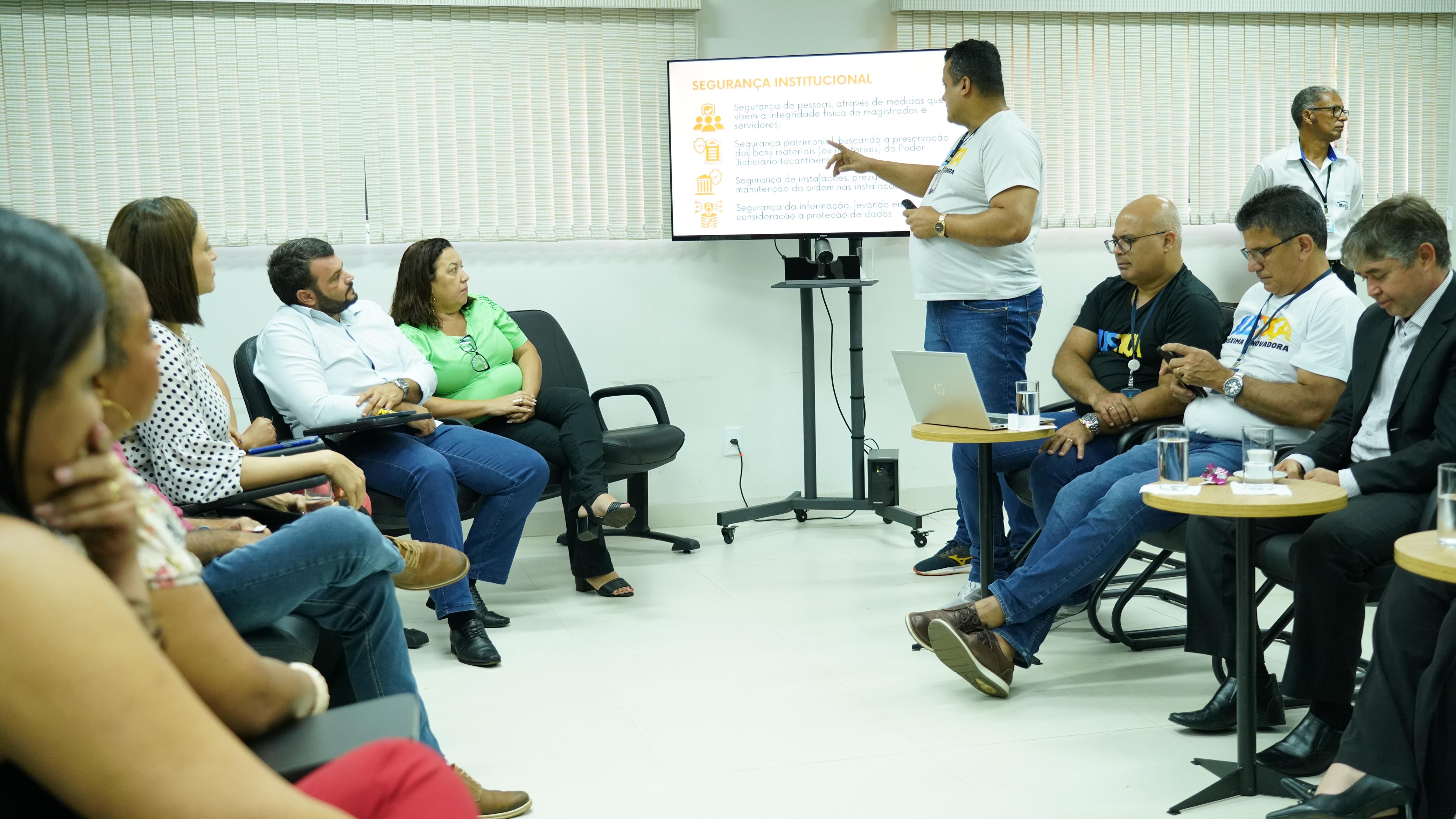 O assessor militar adjunto do TJTO, tenente coronel Ricardo Apolinário, falou sobre procedimentos de segurança institucional, com foco na integridade dos trabalhadores e trabalhadoras do Poder Judiciário. Dentre outros assuntos, no âmbito da segurança do servidor, falou sobre a importância do uso do crachá, segurança patrimonial, segurança da informação e instalações.