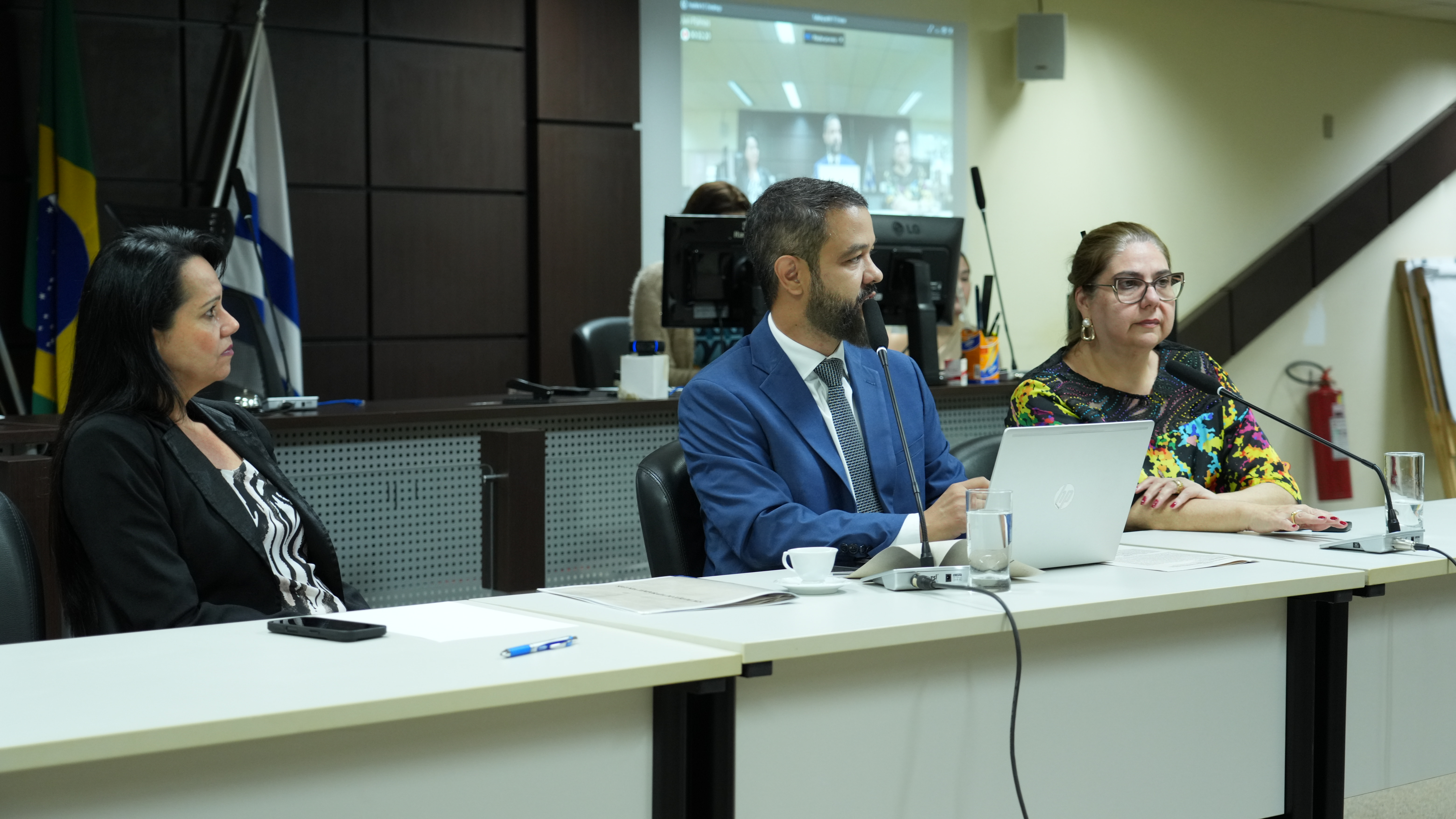 Rondinelli Ribeiro/Cecom/TJTO pessoas sentadas no tribunal do júri e três magistrados na mesa durante reunião preparatória com jurados da capital