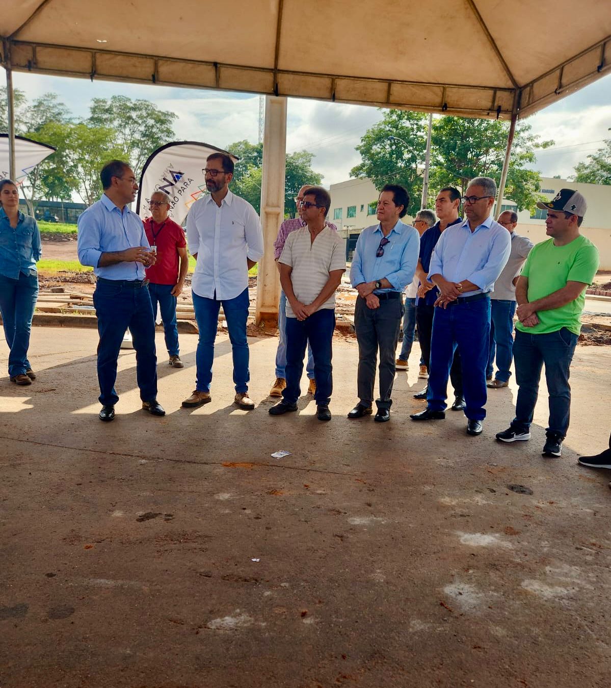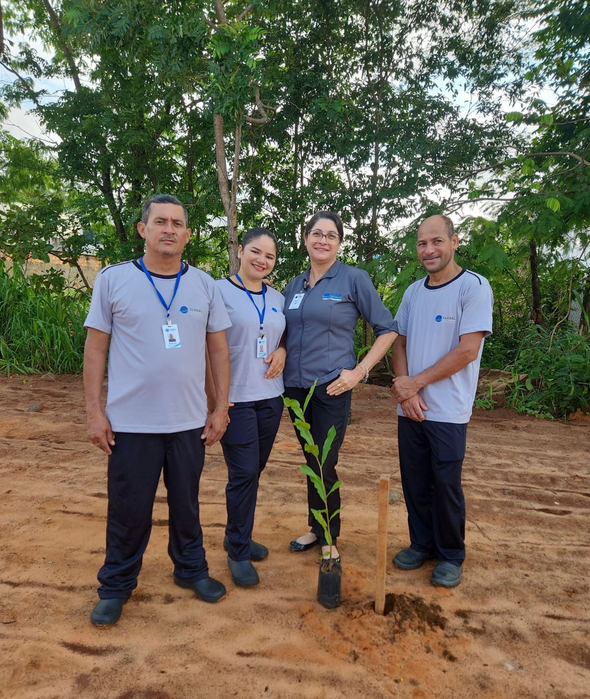 A foto mostra um grupo de pessoas posicionado em um estacionamento pavimentado, reunido atrás de uma muda já plantada em um canteiro quadrado de concreto. Ao fundo, aparecem um prédio, veículos e fiação elétrica. A cena ocorre ao ar livre, em dia ensolarado.