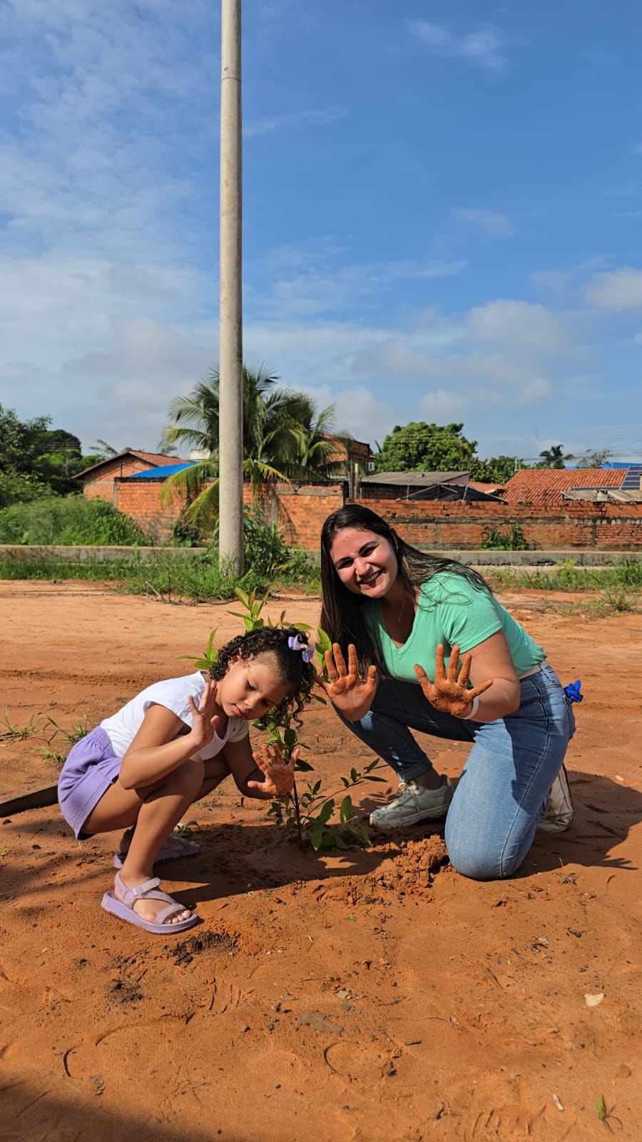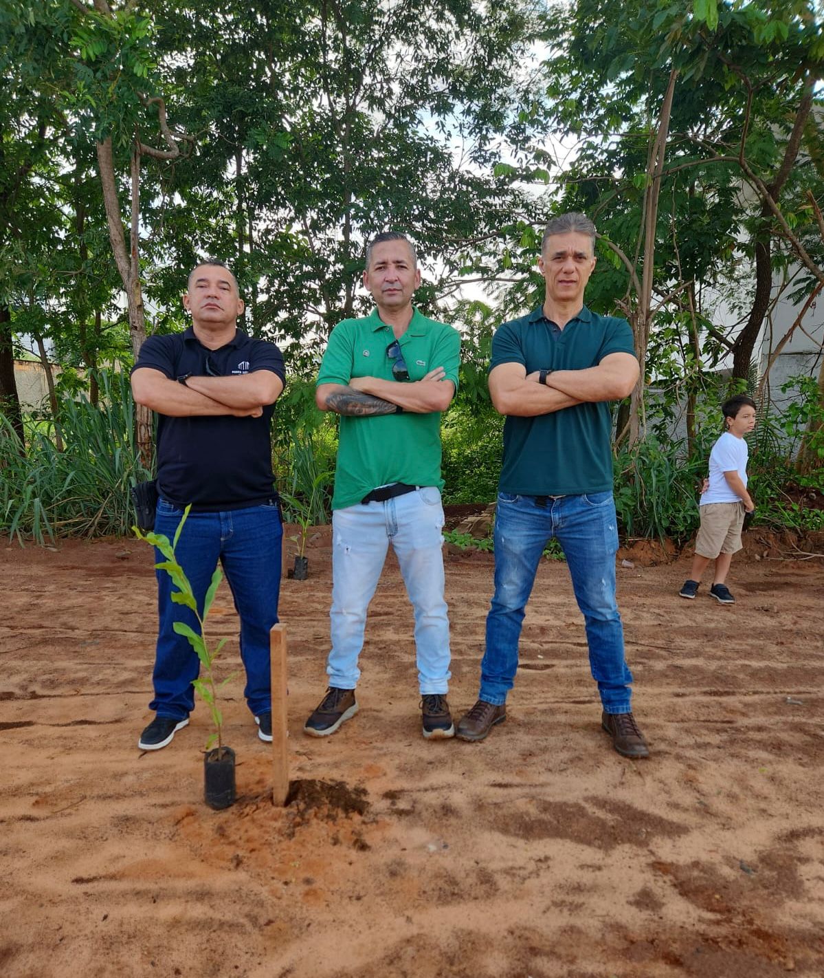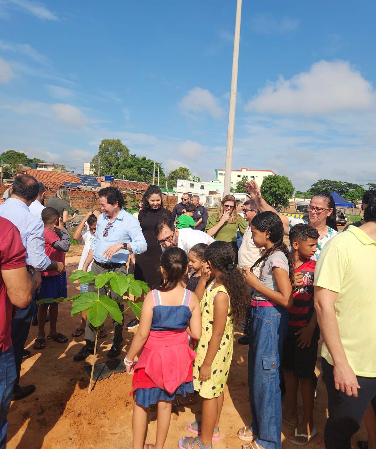 Cecom/TJTO A foto mostra um grupo de pessoas durante o plantio de uma muda. Dois homens ajoelhados posicionam a planta no solo enquanto crianças e adultos observam ao redor. Alguns participantes batem palmas; outros registram a cena com o celular. A ação ocorre em área de terra batida sob céu aberto.
