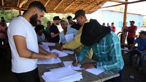 Durante reunião em uma barraca de palha, que começou por volta de 9 horas, os posseiros e posseiras tiveram a oportunidade de tirar as mais variadas dúvidas em relação à situação deles na fazenda e também receberam explicações sobre a situação do processo pelo desembargador João Rigo e pelo juiz Márcio Soares da Cunha.