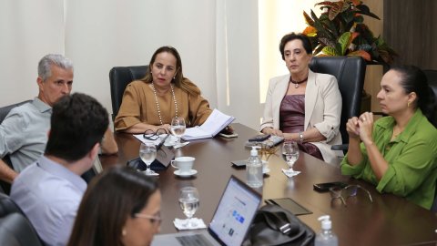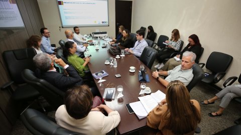 Elias Oliveira A imagem mostra um grupo de adultos reunidos em uma sala de reuniões, sentados ao redor de uma grande mesa retangular. Há diversidade de idade, aparência e trajes, que variam entre estilos profissionais e casuais. Sobre a mesa, há tablets e laptops.
