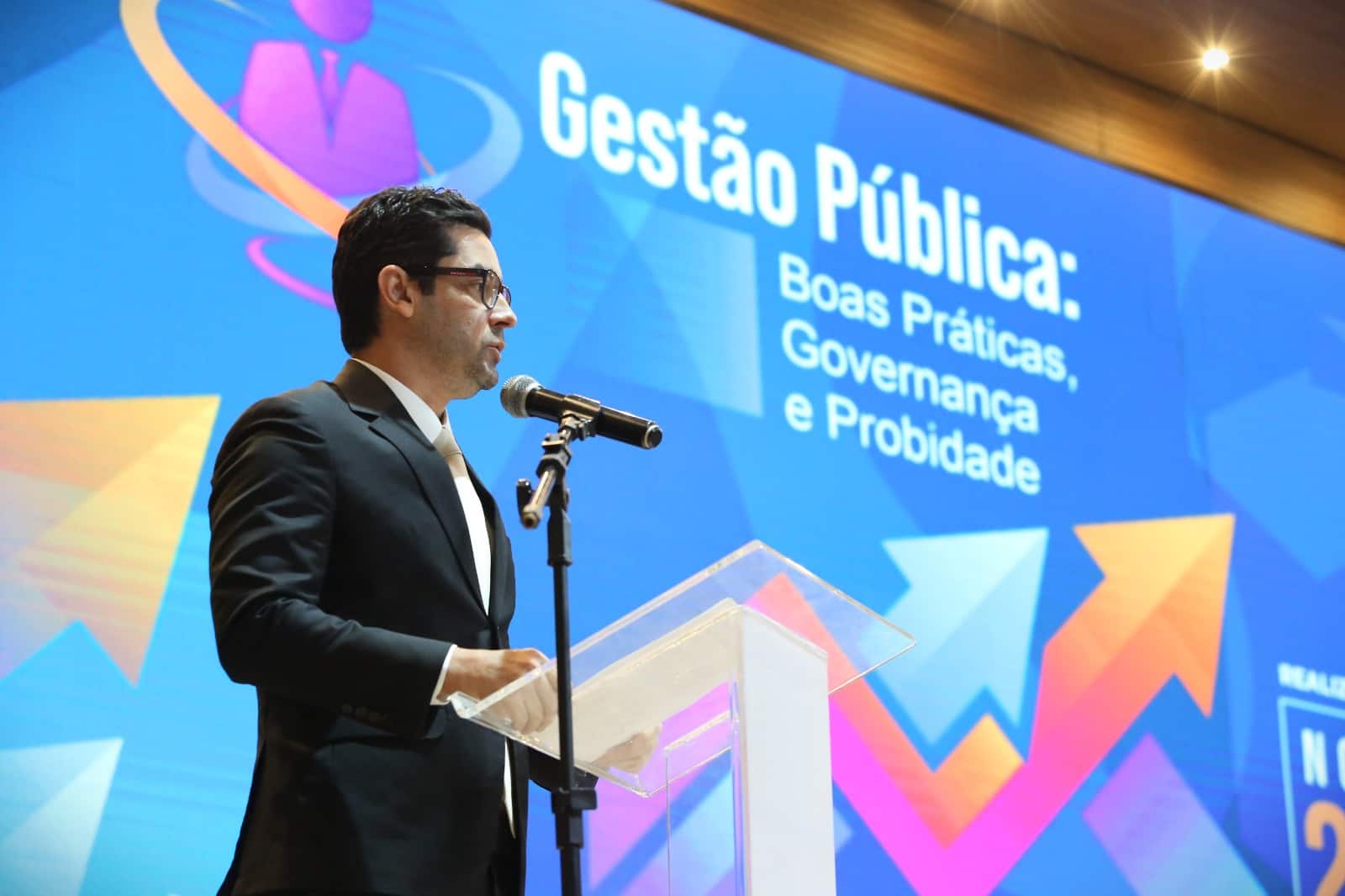 Foto: Hodirley Canguçu imagem mostra um auditório lotado e no palco autoridades sentadas e uma delas discursando em pé no púlpito.  No fundo do palco um telão de led com a logomarca do evento escrito Gestão Pública, Boas Práticas, Governança e Probidade