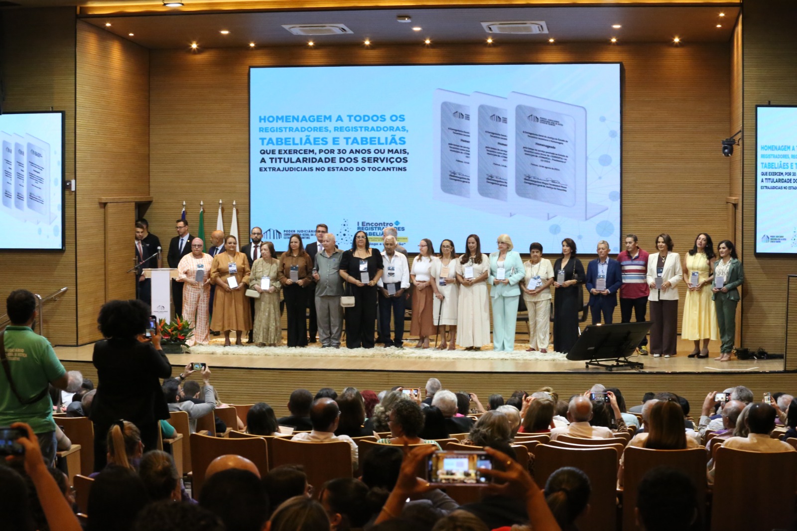O auditório do Tribunal de Justiça do Estado do Tocantins foi palco, na noite desta quarta-feira (14/8), de uma honrosa homenagem a 130 registradores, registradoras, tabeliães e tabeliãs tocantinenses, que ao longo de 30 anos ou mais se dedicaram ao serviço público notarial e registral. A homenagem foi entregue durante a abertura do 1º Encontro Estadual dos Registradores e Tabeliães das Serventias Extrajudiciais e a Corregedoria Geral da Justiça do Tocantins (CGJUS).