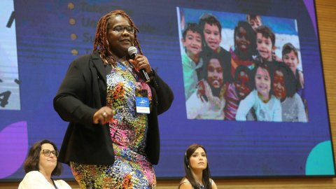 “Hoje, por exemplo, vocês estão vendo uma mulher negra vinda dos Estados Unidos. Lá a nação diz que todos podem estudar, mas nós negros não sabíamos como fazer isso. O racismo é ultrajante e traz muitos danos sociais e emocionais. Precisamos ver nossos alunos. Nas práticas da justiça restaurativa é importante explorar a história, conhecer e valorizar as pessoas, ter conexões. A conexão leva a mudança e isso é possível quando nossos corações se respeitam e permitem criar essas pontes. Quando você alcança o coração dessas crianças, você consegue ver a mudança acontecer. Maltratar, ignorar, ser indiferente só piora. Estamos falando de pessoas que necessitam ser salvas. Eu não faço nada que eles podem fazer por conta própria como amarrar um cadarço. Temos que saber o que está impedindo ele de se autocuidar. Temos que criar pontes e ajudá-los neste resgate por meio da equidade que é diferente da igualdade. Equidade está associada à justiça, o que cabe a todos, olhando a estrutura, o todo. Não é fácil, um processo longo que exige tempo e compaixão, com análise da estrutura familiar do aluno, condição socioeconômica, familiar, cultural e todas as condicionantes envolvidas”.