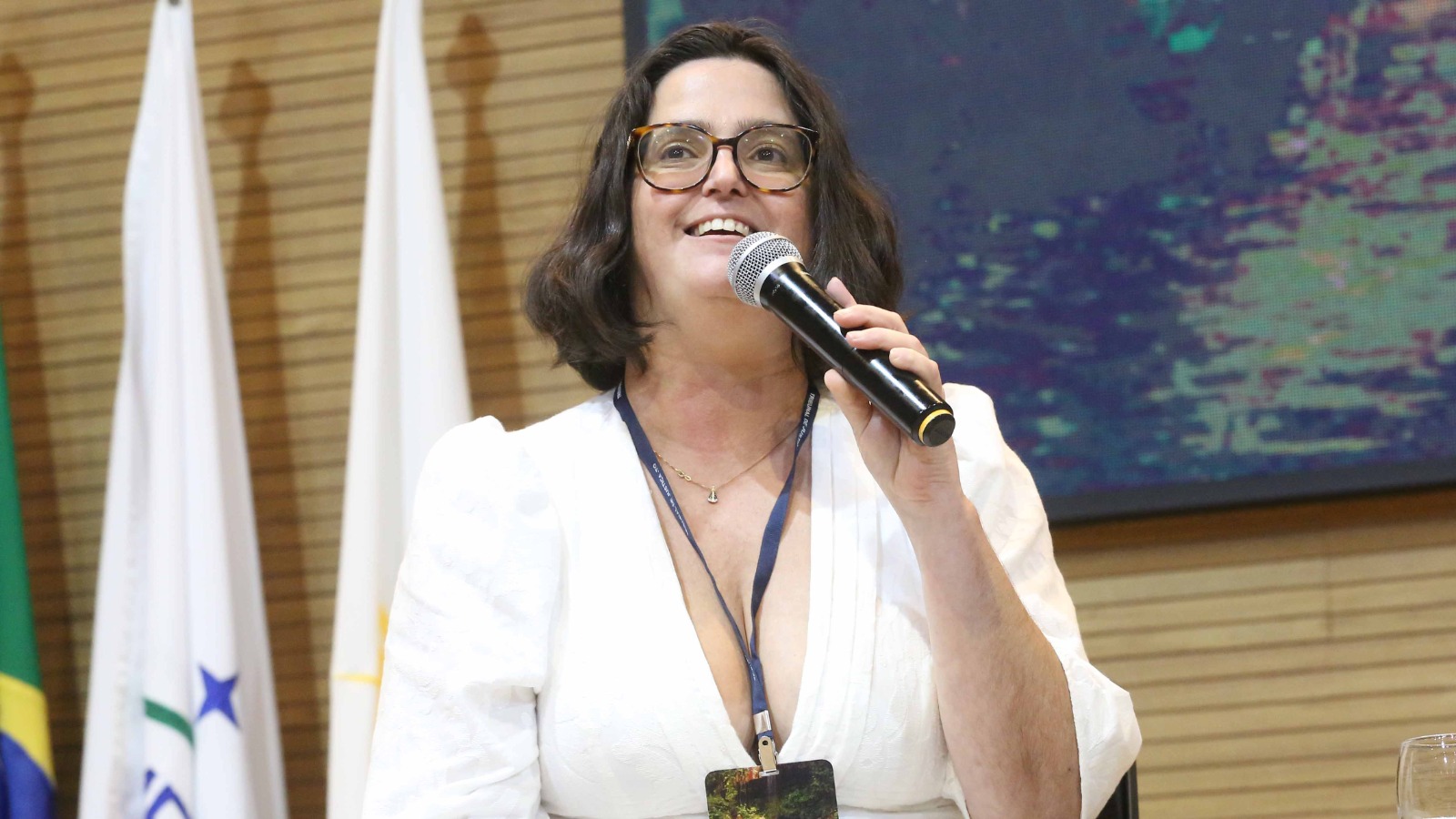 Elias Oliveira Mulheres em pé recebendo certificados, ao fundo quadro com foto de cachoeira e bandeiras na lateral