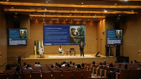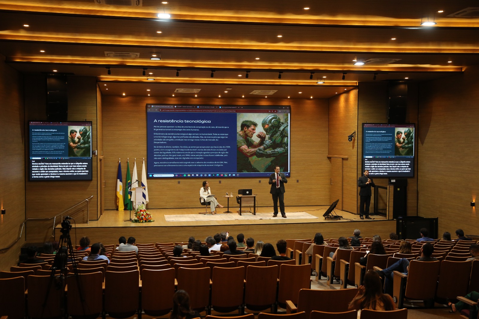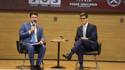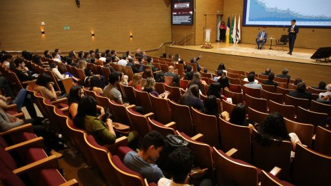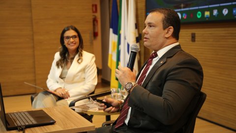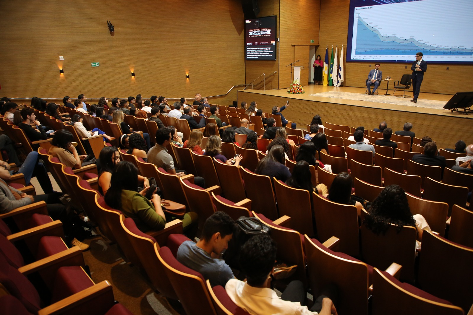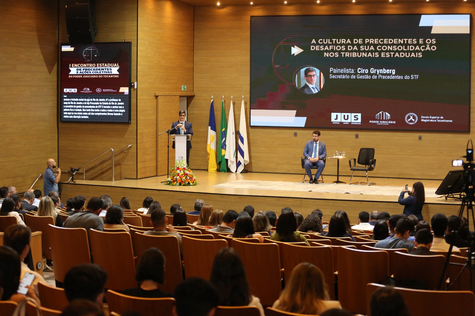 Elias Oliveira A imagem mostra o auditório do Tribunal de Justiça do Tocantins (TJTO). No palco centralizado, há um palestrante em pé e outro sentado. Atrás deles, há um painel de fundo. O auditório está organizado com várias pessoas sentadas em fileiras, caracterizando um ambiente formal.