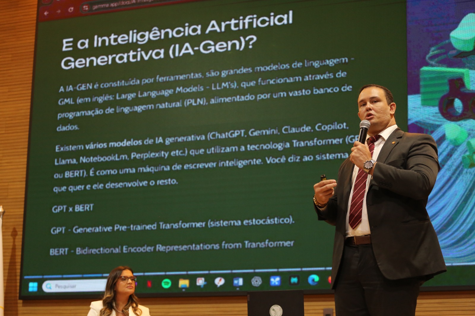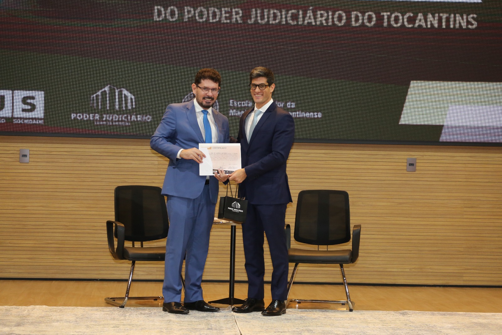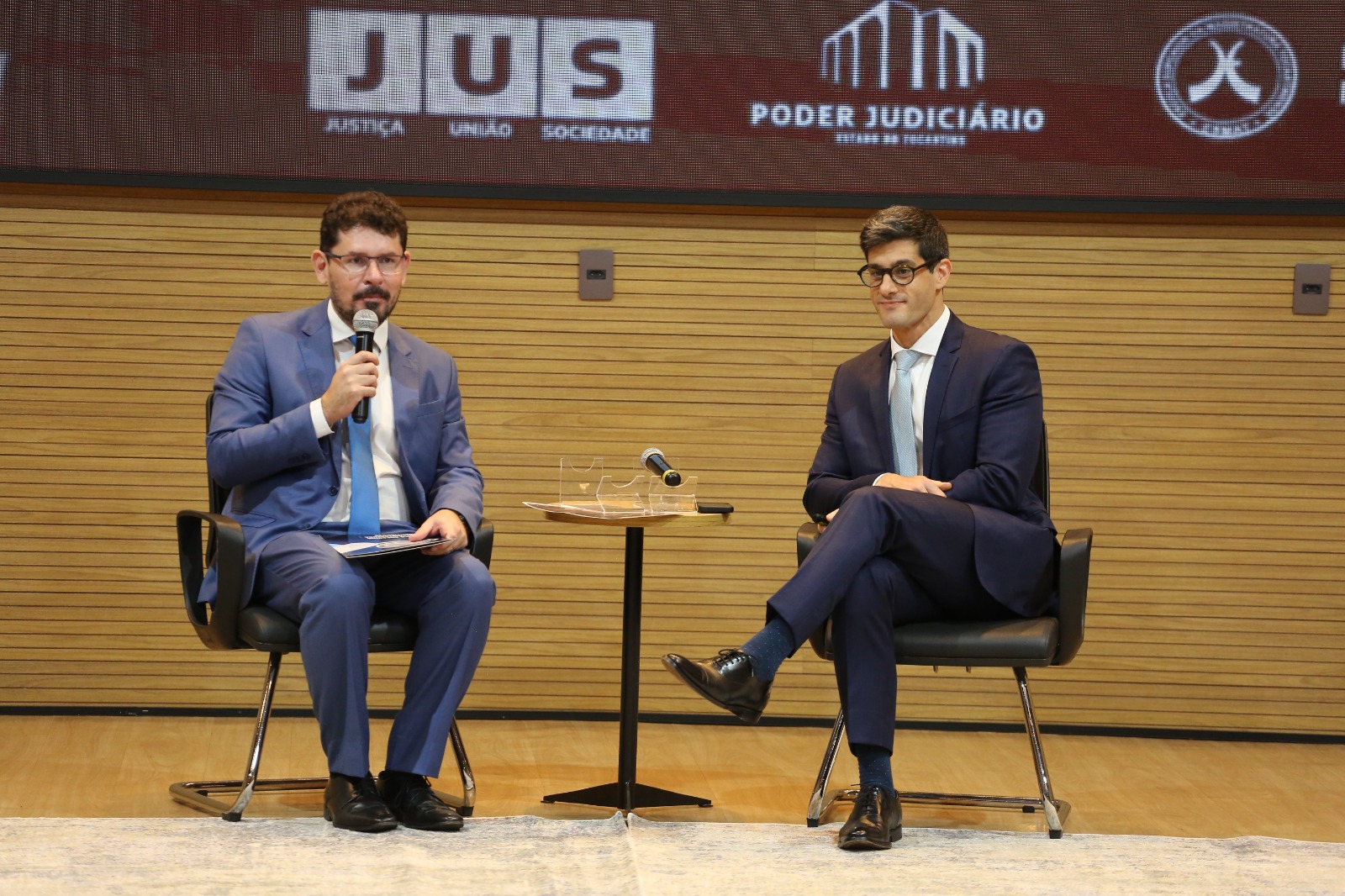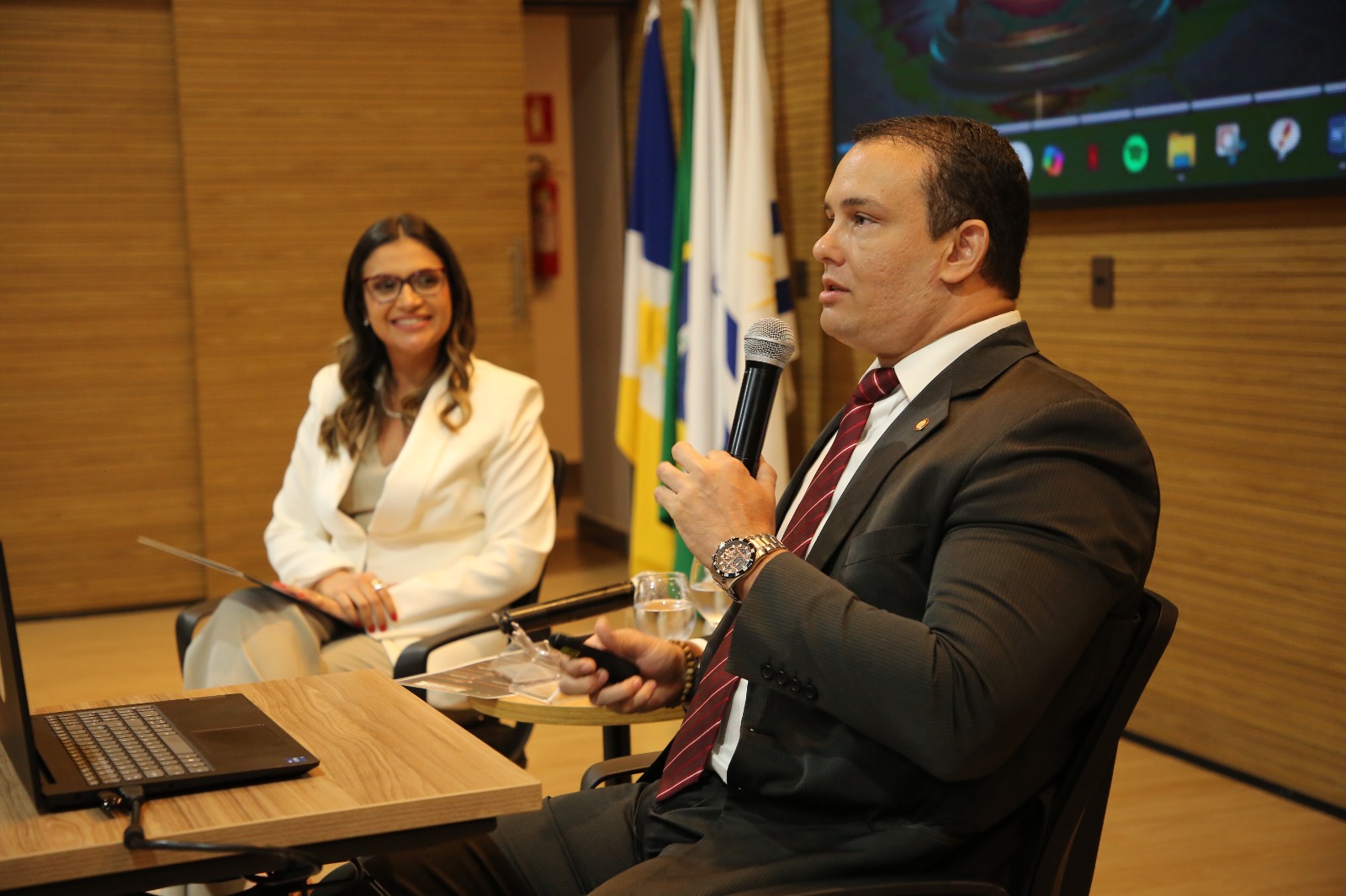 Elias Oliveira A imagem mostra o auditório do Tribunal de Justiça do Tocantins (TJTO). No palco centralizado, há um palestrante em pé e outro sentado. Atrás deles, há um painel de fundo. O auditório está organizado com várias pessoas sentadas em fileiras, caracterizando um ambiente formal.