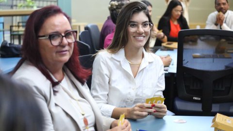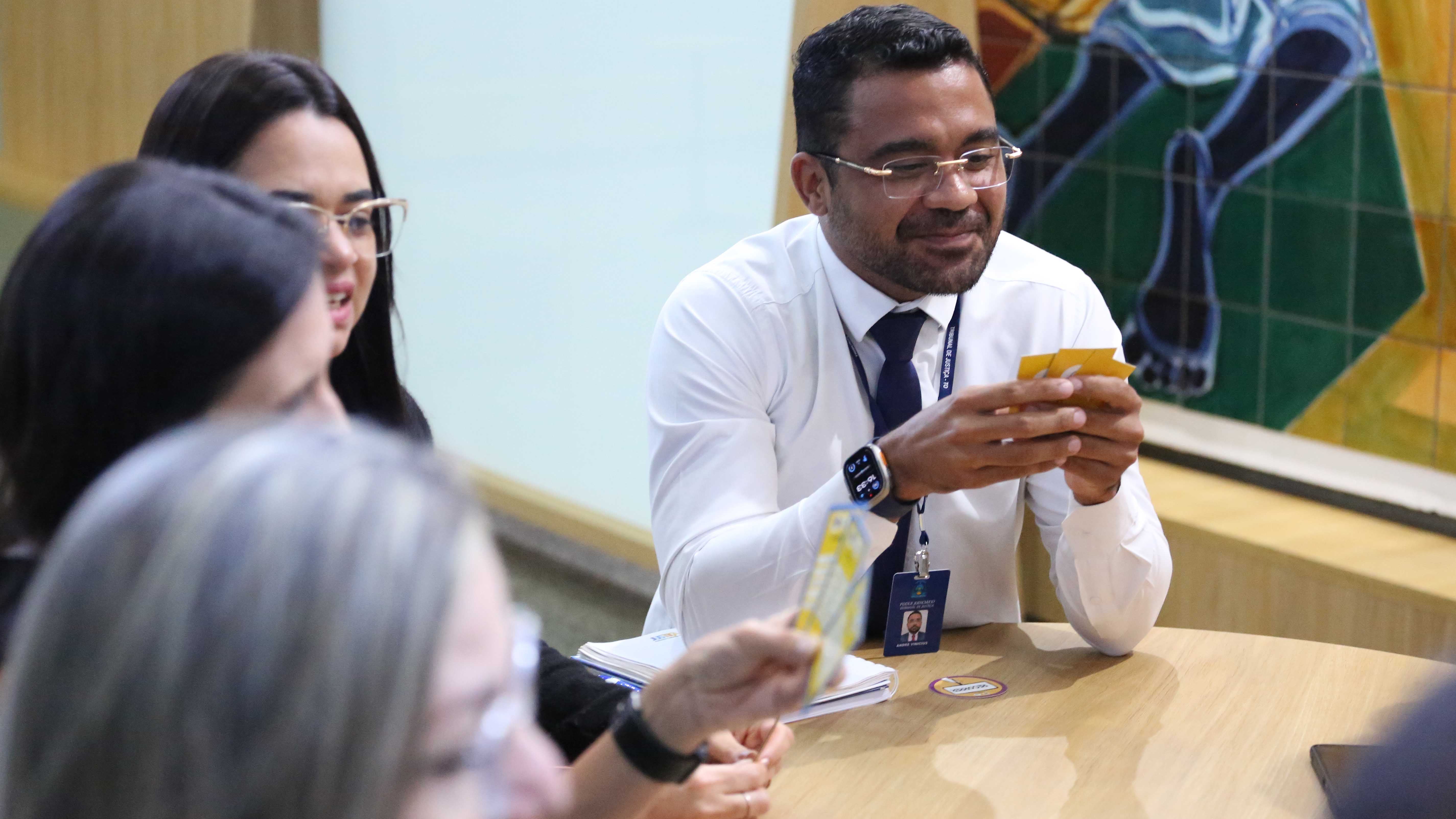Usando cartas com palavras simples em uma das mãos para simplificar termos complexos em cartas colocadas na mesa. Assim, de forma lúdica e divertida, e visando facilitar a comunicação com o cidadão e a cidadã, magistrados(as) e servidores(as) do Judiciário do Tocantins participaram de uma dinâmica sobre linguagem simples, nesta quarta-feira (26/6).